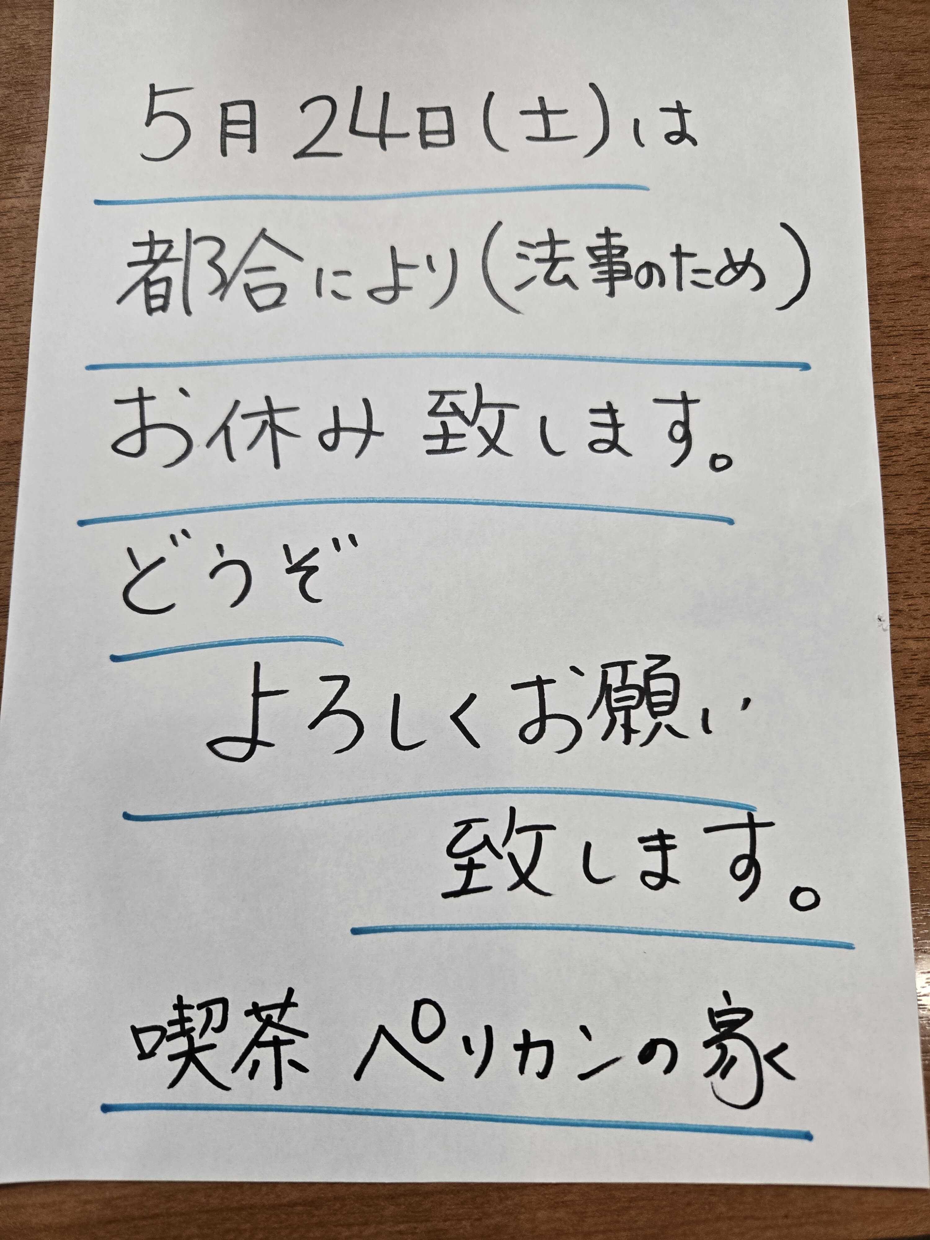 5月24日(土)はペリカンの家都合により(法事のため)お休み致します。よろしくお願い致します。