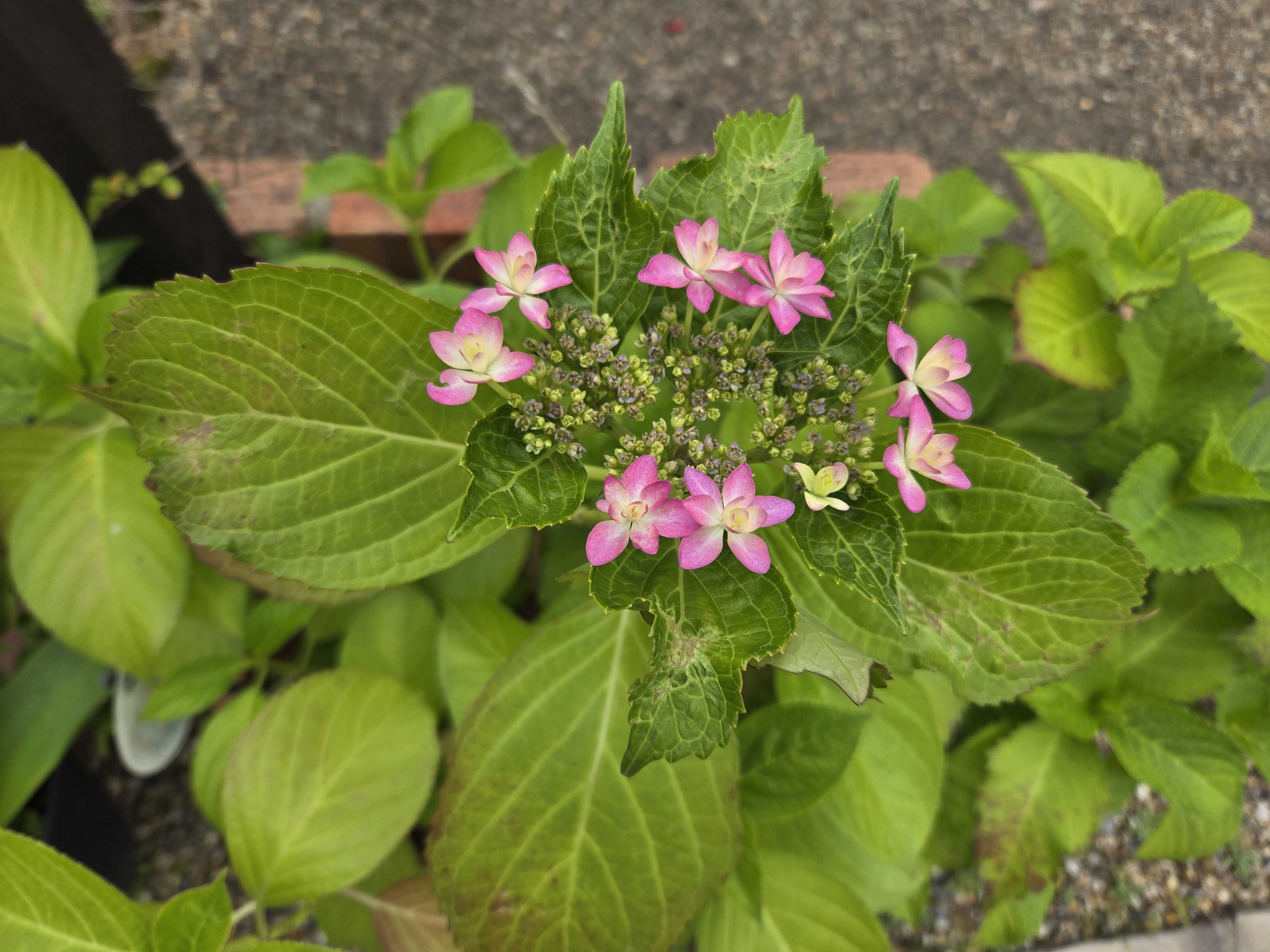 ピンク色のガクアジサイが咲きました❗かっわいい😊