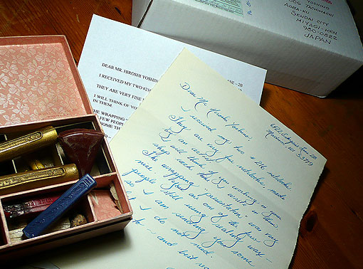 アメリカからUSPSで荷物が届いていました。送り主は見覚えのない外国の方。いや、どこかで見たような…なんだろう?中にはアンティークの紙製の箱、手紙が2通、名刺が1枚。1通の手紙には美しいカリグラフィで書かれていて、私の名前で始まっていました。どうやら私宛の手紙には違いないようです。もう1通にはブロック体で同じ文面がプリントされていました。箱を開けてみると、日本ではあまり見かけないようなチーズ型やかまぼこ型のシーリングワックスがぎっしり入っており、使いかけの物も混じっているようでした。送り主は、去年の暮れに手帳のオーダーをいただいた方で、シーリングワックスで包装した私の手帳がお気に召されたらしく、「私もシーリングワックスを使う少数派の一人です。アリガトウ」で文章は終わっていました。今日、早速返事を出しましたがもちろん私は英語がペラペラ(の知識)なので、今回もレッドのコッカーさんにノーギャラで翻訳、外国人の方へ手紙を出す時のルールなどを御指南してもらいました。ありがとうございました。