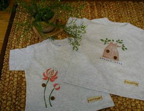 お久しぶりの更新です。じーだぶりゅ(G.W)期間中は毎日出歩き、夫の実家に行き(私と子供の2人旅・・夫は仕事なので毎回恒例。夫の両親とお姉さん達とは夫より確実に仲良しです・・)ほか色々・・楽しかった日々。今週はブログを再開、じーだぶりゅ、の出来事を書いたり、商品とかについてもupして~・・・・なんてのんきに考えていましたが、なんかあっというまに火曜日に!連休の疲れが今頃から出だして子供と一緒に寝てしまう今日この頃。なのでなので先日撮影した今週の土曜日にJR八王子駅前で行われる「アート・ムーチョ」に出す商品(新作など)を大まかにご紹介しようと思います☆手作り品ばかりが集まるアート・ムーチョ。なにやら楽しそうな感じですよ・・。まずTシャツ・・・スタンプTシャツを作りました。消しゴムスタンプで、です。いつものアップリケものに比べると手抜き!?いえいえ。右脳はものすごく使いましたから(笑)。2日ほど(笑)。お花はちょっとオリエンタル風にしてみたつもり・・・。うすいグレイ地なのでさらっとジーパンなどにあわして着ていただいてもいいかも。お花中央部分は花柄の布そしてちょこっと刺繍を。木は男の子をイメージして壮大に「星の王子様」でもおなじみの「バオバブの木」をモチーフに使いました。星の王子様のおはなしの中ではちょっと悪者のイメージだけどアフリカじゃ崇拝されている木なんです・・。力強い、ユニークなカタチが大好きです。子供向けにちょっと可愛くアレンジしました。そして「BAOBAB TREE」の文字を。どちらにも木ボタンをあしらっています。(布用スタンプ台を使用していますのでお洗濯でも色落ちなしです)コチラはfamちゃんデザインの「カブトムシ」「クワガタムシ」のTシャツ。虫の苦手なお母様にもこんなラブリーなカブト達だと気に入ってもらえるかな。子供らしさが映えるデザイン。実際子供ちゃん達にも大人気なのです♪私も私の子供もひと目見て恋に落ちましたから(笑)。ブラウンカラーのボディに手足の部分は小さなドットプリントを使っています。目の部分は木ボタンで。木ボタン万歳!(笑)同じくfamちゃんデザインの「りんごTシャツ」。こちらもブラウンカラーの薄いニット地にカットワークのコットン生地を使用。飾りパーツにも葉っぱのボタンが施されています。famちゃん今回Tシャツ初参加ですがとびきりステキなデザインで今後に期待大です☆私以上にすっとぼけている人ですがいつも忙しい最中、確実にサクサクと製作してくれる頼もしい相棒さんです。頼りにしていますぞい。後はパンツでは・・・やわらかコットンのヘンプポケットつきパンツ。とっても肌触りのよいコットンです。足首見せてはいてもとってもカワイイ。今回はチューリップハットも登場です。あとは去年人気のあったもので・・・・(詳しい画像はフリーページのTシャツの所をご参照下さい)ゾウさんTシャツ・・恐竜Tシャツ・・カメラTシャツ・・・カタツムリTシャツ・・・とりさんTシャツ・・などなど。パンツも去年好評のストライプパンツなども登場いたします。あとはバック。まだカタチに出来てないので(汗)頑張ります・・。大丈夫かな~。まっ、なんとかなるさ~と思いつつ時間は着々と土曜日へと進んで参ります。ああ・・。今週このあと更新できないかもしれないのですが、もしまた皆さんのところにお邪魔できるようだったら遊びにいかせて頂きますので宜しくお願いします。「行けたら行くよ~!」と言ってくださった方、本当にありがとうございます。私も八王子の駅に降り立つのは初めてなので軽く緊張しているかと思いますが、もし見つけたら気軽にお声かけて下さいね。お時間ですが朝11時~夕方6時までやっています。(雨天の場合は残念ながら中止だそうです・・・晴れるといいな~)