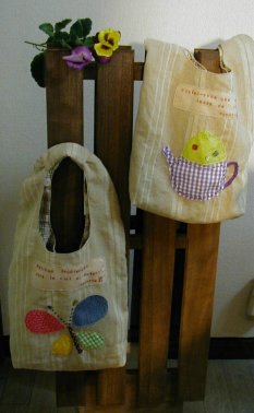 ふ~、間にあった・・・。どうにか・・バック完成しました。もう、すでに抜け殻のようです(笑)イベントは明日だというのに☆昨日も夜子供と共に寝てしまい、夫が寝る頃(昨日は2時頃)にはっと目が覚めて私「あっ、おっ、おかえり~!」夫「もうとっくに帰ってるって・・」私「ははは・・。ごはんは~」(一応ご飯は毎日ちゃんと作ってます・・ハハ)夫「あのさ。俺帰ったの12時だよ、もうとっくに食べてるって!」とまたもあきれられ苦笑されつつ、夫に対しても作業に対しても、またやってしまった・・と半泣きになりそうになりながらごそごそ起きだして作業してました・・。しかしそんな時でも「あんまり夜更かししすぎないでね!」と一応声をかけてくれる夫。部屋も散らかっているというのに特に何もいわず、とっても辛抱強い・(というか多分気にしていない・・)この人でよかった(笑)。バックですが。本当は4つ作るはずが。どうにもこうにも間に合わん!というわけで2つのみの出品でございます・・。リネン生地を使ってcocotteモチーフのショルダーバック。(pepinoじゃないんだな~これが・・笑)ポットの方は「Voulez-vous une autre tasse de the’?(お茶をもう一杯いかが?)蝶チョの方には「Papillon l’eg`erement dans le ciel du ressort」(春の空に蝶チョ、軽やかに舞う)・・・とスタンプしました。(フランス語のキーボードでの表示の仕方が分かりませぬ)蝶チョのは私も気に入りました(笑)。売れなくてもいいの。私が使うから~(笑)リネン生地ってくったりした感じがなんというかとっても風情があって素敵・・この生地はちょこっと白いラインが入っていて爽やかな感じ。ちなみにバックをかけたスタンドは先週末にfamちゃんと友達とホームセンターの工作室にて3人で作りました~。ヒノキで出来たすのこ・・軽い。2枚入りで500円でした。間に蝶番をつけて折りたためるようにします。板を貼って高さを出しています。そしてガーデニング用のペンキでペイント。サクサクサク・・みんなで作れば早いぞ!これを2台作り真ん中に太目の長い枝を渡してハンガーを掛けて展示します。今後のイベントで使うためにも折りたためて、軽く持ち運びできる什器が必要だったので安くてわたし達らしいものが出来てよかったです。あ~お天気。微妙です・・・・。今夜は雨らしいけど。お天気になってください~。明日の朝6時に実行委員会のほうから開催の有無のメールが来るんですが、出展者の方々もやきもきしてるだろうな~。てるてるぼうずでも作って神様にお願いしておこう・・。先日のコメント、とっても嬉しく拝見しました。皆さんのメッセージは本当に暖かくいつも私の心にやわらかい希望の光を与えてくれます。ありがとうございます。ここ数日ろくに皆さんのところへも行けずに失礼しているbamですが来週あたりにゆっくりお邪魔しますので宜しくお願いします☆