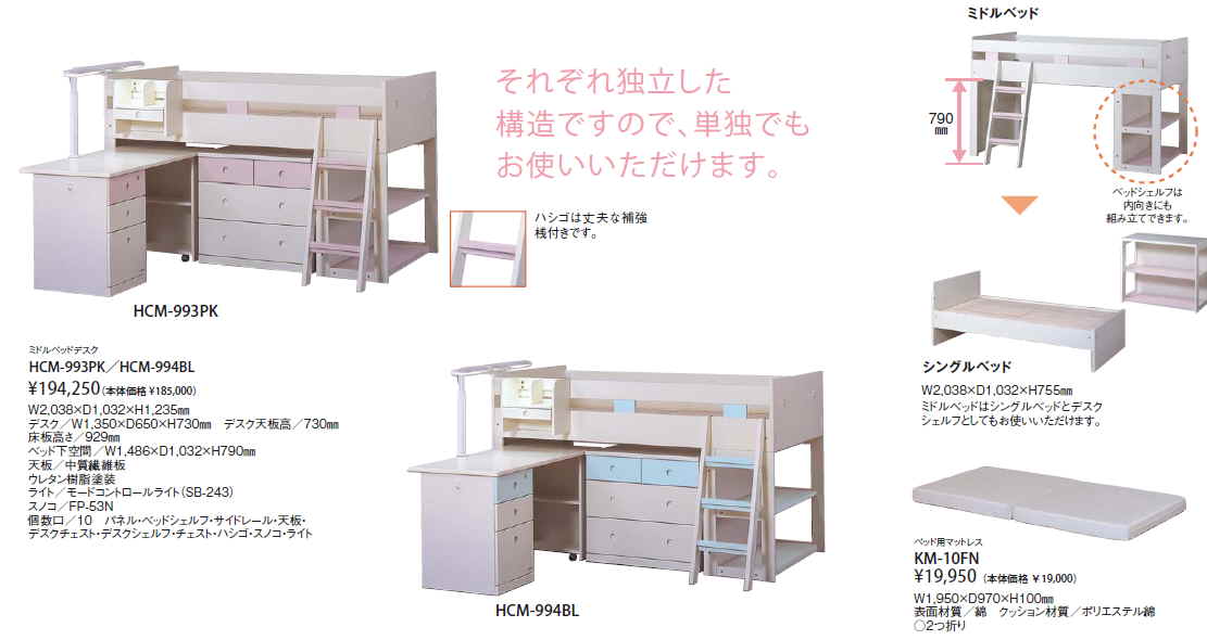 送料無料かわいいホワイトピンクブルーデスク・ベッド・チェスト付きコイズミミドルベッドデスクHCM-993PK/HCM-994BL白色モードコントロールライト付きコイズミ学習ミドルベッドデスクKIDS CONPO-MULTIキッズコンポマルチデスクすのこベッド付き学習机KOIZUMI DESKBED メーカー希望小売価格 194,250円 (税込) 特別価格 120,000円 (税込) 送料込 主材は、中質繊維板、ウレタン樹脂塗装です。 ライトはモードコントロールライトです。 デスク・チェスト・シェルフ・ベッド・ハシゴ付きです。 それぞれ単独でも使用が可能です。 ベッドの床はスノコ板です。 マットレスは別売り(12,500円)です。 マットレス 幅195×奥行97×厚み10cm 送料無料 北海道(2万円)・沖縄(4万円)は追加送料が必要です。 離島は、別途見積りいたします。 サイズ 幅203.8×奥行103.2×高さ123.5cm 床板高さ 92.9cmベッド下空間 幅148.6×奥行103.2×高さ79cmデスクのみ 幅135×奥行65×高さ73cmシングルベッド 幅203.8×奥行103.2×高さ75.5cmチェストのみ 幅80×奥行50×高さ73cmブックシェルフのみ 幅40.9×奥行22×高さ35.7cm仕様 組立品 お客様が組立てて頂きます。色 ホワイトピンク色 または ホワイトブルー色 (モニター・撮影環境等により画像の色は異なります) 家具インテリア館タゴホームpesfisの本棚 楽天ベストセラー楽天子供部屋市場子供部屋 学習机 子供部屋 イス 子供部屋 ベッド 子供部屋 ライト・照明 楽天インテリア・寝具・収納市場システムベッド通気の良い丈夫なすのこ床板付きミドルベッドデスクHCM993PKコイズミ製ミドルタイプベット付き学習デスク学習机システムベットHCM994BLすのこベッドデスク【送料無料】かわいいホワイトピンクブルーデスク・ベッド・チェスト付きコイズミミドルベッドデスクHCM-993PK/HCM-994BL白色モードコントロールライト付きコイズミ学習ミドルベッドデスクKIDS CONPO-MULTIキッズコンポマルチデスクすのこベッド付き学習机KOIZUMI DESKBED上質木質感のタモ材を使用スペシャルモデルオカムラ製ピエルナの様にデスクの高さが変えられるコイズミ製学習デスクコンセント付きLEDサブランプ付きアームライトLDF-840BS高級LDF-839NS【送料無料】2012年型お子さまの成長に合わせて天板の高さが8段階と3つのスタイルに変えられるコイズミ学習デスク天板は天然木タモ材突板素材LIDEA SPECIAL リデアスペシャル学習デスクKOIZUMIDESK天板昇降学習机スタンダード・ユニット・セパレートスタイルデコレーションシールでキラキラのコイズミ木製ラブリー学習椅子ラバーウッド天然木製学習デスクチェア学習デスクイス木製学習イスデスク椅子木製ラブリー学習チェア【送料無料】可愛いハートモチーフ座面もハートプリント生地の木製すのこトレー付きカラフルラブリーデスクチェア背面がハート形のコイズミ木製ラブリーチェア大人気の天然木製学習椅子KOIZUMI WOODEN LOVELY CHAIR キャスター付き木製学習チェア・ハートピンク色木部3色選択