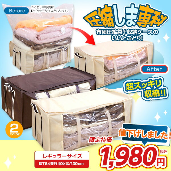 布団圧縮袋と収納ボックスが一体になった便利品!衣替えや引っ越しの荷造りにも便利な製品です。【あす楽対応】【送料無料】圧縮しま専科(レギュラーサイズ) 特価 2,580円 (税込) 送料込 ご希望のお色をご選択下さい ブラウン アイボリー 圧縮できる容量の目安 シングルの掛けふとんなら3~4枚。 セーターやトレーナーなら約40枚収納可能。 ここがポイントです。重ね置きもできるので、収納スペースを有効活用できます。 75ミクロンの厚手の圧縮袋なので、繰り返し使用できてお財布にも優しい。吸引圧縮しやすい大型バルブを採用。中身を固定できるベルト2本付き。大きな透明窓があるので、圧縮した中身が確認できます。中身や使用者の名前を書いておける便利なメモスペースもあります。取っ手も左右と側面についているので、持ち運びもラクラク。 材質 バルブポリエチレン・ポリプロピレン・ポリアセタール・シリコーンゴム ボックス(生地)不織布、(テープ)ポリプロピレン、(芯板)パルプ(バックル)ポリアセタール、(ファスナー)ナイロン 圧縮袋(フィルム)ポリエチレン、(スライダー)ポリアセタール サイズ(重量) ボックス: 約幅75×奥行40×高さ30cm(約1.1kg) 製造国 中国製(日本で企画し、中国提携工場で製造したた商品です。) あっお勧め!素敵生活のナイスデイpesfisの本棚 楽天ベストセラー楽天インテリア・寝具・収納市場 布団圧縮袋と収納ボックスが一体になった便利品!衣替えや引っ越しの荷造りにも便利な製品です。【あす楽対応】【送料無料】圧縮しま専科(レギュラーサイズ)【RCPdec18】布団圧縮袋と収納ボックスが一体になった便利品!衣替えや引っ越しの荷造りにも便利な製品です。【あす楽対応】【送料無料】圧縮しま専科(ワイドサイズ)【RCPdec18】 布団圧縮袋と収納ボックスが一体になった便利品!衣替えや引っ越しの荷造りにも便利な製品です。【あす楽対応】【送料無料】圧縮しま専科(組布団用)【RCPdec18】