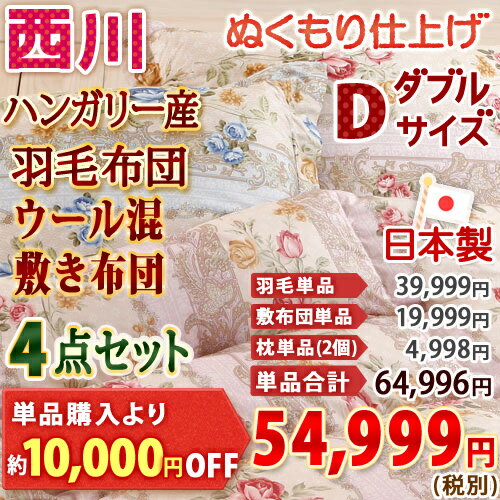西川・羽毛組布団セット・ダブル・日本製 西川リビング 羽毛布団4点セッENWD834柄 軽量羽毛布団+ボリュームアップ敷き布団のお買い得セット!西川リビング【送料無料】ダブル 3 メーカー希望小売価格 102,900円 (税込) を! スーパーセール!プライス 49,998円 (税込) 送料込 羽毛布団4点セット内容~ 羽毛布団ENWD834柄 メーカー品番:1343-83421 サイズ:ダブル190×210cm 中綿:イングランド産ホワイトダックダウン90% フェザー10% 詰め物量(中綿量):1.8kg バイオアップ加工 ダウンパワー380(かさ高155ミリ以上相当) 生地:綿15%ポリエステル85%(軽量生地) キルト:衿フィットキルト 総重量:約2.56kg羊毛混多針固綿敷き布団/中芯ボリュームタイプ834柄 メーカー品番:1333-83422 サイズ:140×210cm 側生地:綿100% 抗菌防臭加工 巻き綿:ウール50% ポリエステル50% 2.8kg 中芯:固綿/ポリエステル100%(ボリュームタイプ)4.2kg 中綿総量:計7.0kg ポリエステル枕834柄(枕は2個) メーカー品番:1314-83414 サイズ:43×63cm 生地:綿100% 抗菌防臭加工 中身:ポリエステル100%わた500g カラー:ピンク1個サックス1個の計二個でのご用意になります。 上記すべて日本製西川チェーンふとんタウンpesfisの本棚 楽天ベストセラー楽天インテリア・寝具・収納市場 布団セット ダブル10/25迄86時間限定!P5倍★西川チェーン賞9年連続受賞★安心品質♪西川羽毛布団セット・送料無料 ダブルお布団セット組布団組ふとん羽毛ふとんセット【西川・羽毛組布団セット・ダブル・日本製】西川リビング 羽毛布団4点セット/ENWD834柄 軽量羽毛布団+ボリュームアップ敷き布団のお買い得セット!西川リビング【送料無料】ダブル布団セット シングル10/25迄86時間限定!P5倍★西川チェーン賞9年連続受賞★安心品質♪西川・羽毛布団セット/送料無料!シングル羽毛ふとんセット/組布団セット/西川リビング【西川・羽毛組布団セット・シングル・日本製】西川 羽毛布団3点セット/ENWD834柄 軽量羽毛布団+ボリュームアップ敷き布団のお買い得セット!西川リビング【送料無料】シングル10/25迄86時間限定!P5倍★西川チェーン賞9年連続受賞★厳選♪西川・ダブル羽毛布団セット/婚礼布団ふとんブライダルにも/西川リビング組布団送料無料【西川・羽毛組布団セット・ダブル・日本製】こだわりいっぱい!ダウン増量&軽量化でとっても暖か♪西川リビング 羽毛布団4点セットPWG1323柄(ポーランド産グースダウン)/フロア・畳用/婚礼布団ブライダル【送料無料】ダブル10/25迄86時間限定!P5倍★西川チェーン賞9年連続受賞★上質♪西川・ダブル羽毛布団セット/婚礼布団ふとんブライダルにも/西川リビング送料無料【西川・羽毛組布団セット・ダブル・日本製】西川 羽毛布団4点セット841柄(ポーランド産)/フロア・畳用/婚礼布団ブライダルにも♪/羽毛布団セット【送料無料】ダブル