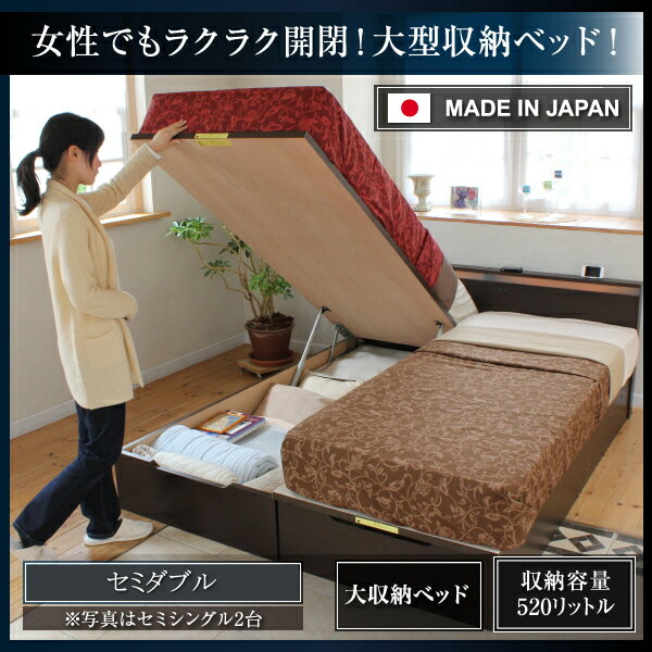 収納ベッド 大容量 大量 跳ね上げ式ベッド セミダブル 収納付きベッド【送料無料】跳ね上げ式大収納ベッド 照明付き・国産ポケットコイルマットレス付 セミダブル94,290円 (税込) のところ 価格 85,524円 (税込 89,800 円) 送料込 サイズ ベッド本体サイズ 幅120×長さ205×高さ70(マット面高48)cm 棚部奥行:8cm 収納部内寸サイズ:幅114×長さ190×高さ24cmマットレスサイズ 幅120×長さ196×厚さ20cm マットレス仕様 ポケットコイルマットレス コイル数:672本 材質 ベッド本体 プリント紙化粧板、桐材 マットレス 側地:ポリエステル100% 備考 ベッドフレーム、マットレスともに日本製 照明10W2灯式、1口コンセント付き お客様組立品(2名60分程度) 当商品は、ベッド1台のみの価格です。 付属のマットレスをご使用ください。付属以外のマットレスは使用できません。 ガス圧シリンダーの強さを、付属のマットレスに合わせています。 付属以外のマットレスを使用した場合、開かないなど収納部の開閉に支障が生じます。 あらかじめご了承の程、よろしくお願いいたします。 女性の方にも楽々開閉。 跳ね上げ ガス圧式収納ベッドです。 ベッドで部屋が狭くなるのではとお考えの方に、大量収納収納ベッドがおすすめ。 ベッドの下が、収納スペースと変わります。 ガス圧式の跳ね上げ大容量収納ベッドで、この価格帯のお値段はとても格安です。 新生活や買い替えのベッドとしても選ばれています。 家具のインテリアオフィスワンpesfisの本棚 楽天ベストセラー楽天インテリア・寝具・収納市場 ガス圧式収納ベッド セミダブル。跳ね上げて大量収納。安心低ホル国産収納付きベッド。ポケットコイルマットレス付き 跳ね上げ式 跳ね上げ 収納 ベッド ベット収納ベッド 大容量 大量 跳ね上げ式ベッド セミダブル 収納付きベッド【送料無料】跳ね上げ式大収納ベッド 照明付き・国産ポケットコイルマットレス付 セミダブル %OFF セール SALE 送料込み ガス圧 大型収納ベット 木製激安ベッド 跳ね上げベットガス圧式 収納ベッド シングル。跳ね上げて大量収納。安心低ホル国産収納付きベッド。ポケットコイルマットレス付き 跳ね上げ 収納 ベッド収納ベッド 大容量 大量 跳ね上げ式ベッド シングル 収納付きベッド【送料無料】跳ね上げ式大収納ベッド 照明付き・国産ポケットコイルマットレス付シングル %OFF セール SALE 送料込み シンプル ガス圧 大型収納ベット 木製激安ベッド)跳ね上げベットガス圧式収納ベッド セミシングル。跳ね上げて大量収納。安心低ホル国産収納付きベッド。ポケットコイルマットレス付き 跳ね上げ 収納 ベッド ベット収納ベッド 大容量 大量 跳ね上げ式ベッド セミシングル 収納付きベッド【送料無料】跳ね上げ式大収納ベッド 照明付き・国産ポケットコイルマットレス付セミシングル %OFF セール SALE 送料込み ガス圧 大型収納ベット 木製激安ベッド 跳ね上げベット