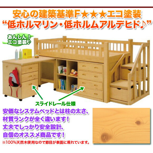 システムベッド 学習机 子供用 木製 階段 子供 ベッド,システム ベッド デスク ロフトベッド 木製 階段付き プレゼント 誕生日 入学祝い 子供家具【1月現金レビュー投稿超特価!税込92,000円⇒税込72,000円!】 メーカー希望小売価格 178,000円 (税込) 家具屋姫超特価 72,000円 (税込) 送料別 送料 4,200円 2倍 1440ポイント 天然木パイン材を贅沢に使用した最高級 階段付き システムベッド、 お子様の健康に配慮した低ホルマリン・低ホルムアルデヒドの 安心エコ塗装仕上げです。 システムベッドの階段・デスク・チェスト&本棚の位置は、お部屋に 合せてシステムベッド本体の左右どちらにも移動・設置可能、お部屋の 空間を最大限に活用できます サイズ 全体サイズ : 幅107.5cm × 長さ234cm × 高さ116cm ベッド内寸 : 幅98cm × 長さ185cm チェストラック : 幅120cm × 奥行35cm × 高さ74cm〔引き出しスライドレール付〕 デスク : 幅106cm × 奥行58cm × 高さ74cm〔引き出しスライドレール付〕 耐荷重 80kg 材質 天然木パイン材 〔低ホルマリン・低ホルムアルデヒド、安心エコ塗装〕 発送形態 組立式 〔一部完成品 : チェストラック、デスクワゴン〕 いいものいっぱい家具屋姫pesfisの本棚 楽天ベストセラー楽天子供部屋市場子供部屋 学習机 子供部屋 イス 子供部屋 ベッド 子供部屋 ライト・照明 楽天インテリア・寝具・収納市場プレゼント 小学生 子供 入学祝いシステム ベッド デスク ロフトベッド 木製 階段付き 子供 机,システムベッド 学習机 子供用 木製 階段 子供 ベッド,プレゼント 誕生日 入学祝い 子供家具【1月現金レビュー投稿超特価!税込79,800円⇒税込72,000円!】プレゼント 小学生 子供 入学祝い【1月末再入荷!予約受付中!】システムベッド 学習机 システムベッド 木製 ロフトベッド 木製,チェストベッド デスク ロフトベッド 階段 デスク ミドル【ご予約現金レビュー投稿超特価!税込79,800円⇒税込64,000円!】