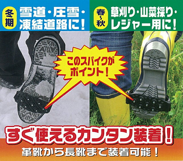 凍結路面の転倒防止 滑り止め スパイク 携帯かんじき 上海問屋 DN-82533 [★] 価格 952円 (税込 999 円) 送料別 タイプ × サイズ Bタイプ Mサイズ Lサイズ 寒い季節の路面凍結。積雪などで足下が滑りやすい朝夜の道路などは危険ですよね。 そんなときのためのスパイクです。 伸縮性のあるTPR樹脂を使用しているので、サイズが合っていれば、運動靴でも、 長靴、ビジネスシューズでも装着できます。 つまに装着して、後ろ側を引っ張りつつ、踵に引っ掛けるだけで取り付けでき、 手軽に使う事ができます。 耐寒性は-40度。通勤、通学以外で雪遊びのグッズとしてもおすすめ。 短いながらもしっかりとしたスパイクピンで路面を捉えて、アイスバーンでも しっかりグリップしますので滑る心配がありません。 コンパクトなサイズで玄関に掛けていても、車内に潜ませておいても場所を 取りませんので、いざという時のために備えておくと便利です。対応サイズ M : 23.5-25cm L : 26-29cm 材質 TPR樹脂、スチール、他 製品保証 初期不良2週間 (※保証期間が過ぎた場合でもご対応いたします。同梱用紙をご確認下さい。) 上海問屋楽天市場 スポーツ・アウトドア アウトドア[送料\399~] 滑り止め スパイク 携帯かんじき :凍結路面の転倒防止 滑り止め スパイク 携帯かんじき 上海問屋 DN-82533 [★][送料\399~] 滑り止め スパイク 携帯かんじき (レディース用) :凍結路面の転倒防止 滑り止め スパイク 携帯かんじき (レディース用) 上海問屋 DN-82540 [★]