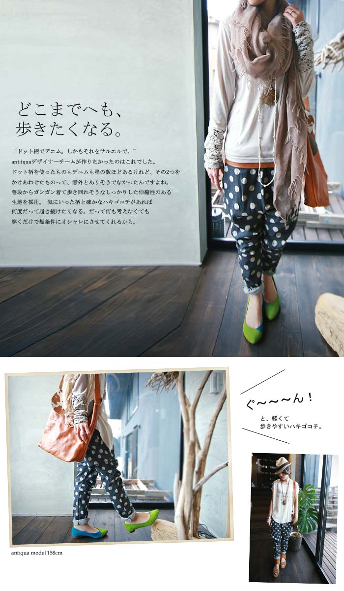 antiqua original『愛すべきドットを贅沢に。』4月15日10時&20時~の2回再販!理想の大人可愛いを叶えてくれるドット柄…。ドット柄サルエルパンツ## 販売期間 2014年04月15日10時00分~2018年10月12日09時59分 価格 6,600円 (税込 7,128 円) 送料別 色 ウォッシュグレー サイズ:総丈 ウエスト(ゴムにより調節可能) ヒップ 股上 股下 裾幅 M 97 66~94 100 39 56 15 素材・裏地・透け感:綿95% ポリウレタン5% 裏地なし透けませんデザインのポイント ウエストは総ゴム仕様で締め付け感のない楽な履き心地を実現してくれます。 ポリウレタン混なので伸縮性も多少あり、決して手を抜いているようには見えない、 ドット柄が抜群のオーラを放ってくれます。 サイドにはポケット付きで機能性も抜群です。着回し力抜群なのでこのデニムがあれば 毎日のコーデがもっともっと楽しくお洒落になりますよ。antiqua楽天レディース ファッション・靴市場楽天市場内で表示される商品価格は、新旧税率が混在していて、税率変更が未反映の場合があります。正しい価格は各ショップの商品ページを必ずご確認ください。×メール便不可!antiqua original『愛すべきドットを贅沢に。』4月15日10時&20時〜の2回再販...価格:7,128円(税込、送料別)×メール便不可!ドルマン シンプル カットソー『ななめにざっくりとブロッキングされたカラー...価格:4,104円(税込、送料別)×メール便不可!『ヴィンテージライクな風合いが大人のこなれ感醸し出す…』4月15日10時&20時...価格:9,180円(税込、送料別)◎メール便可!タンクトップ モチーフ『1枚でオシャレを表現する。』4月15日10時&20時〜の2回...価格:4,104円(税込、送料別)