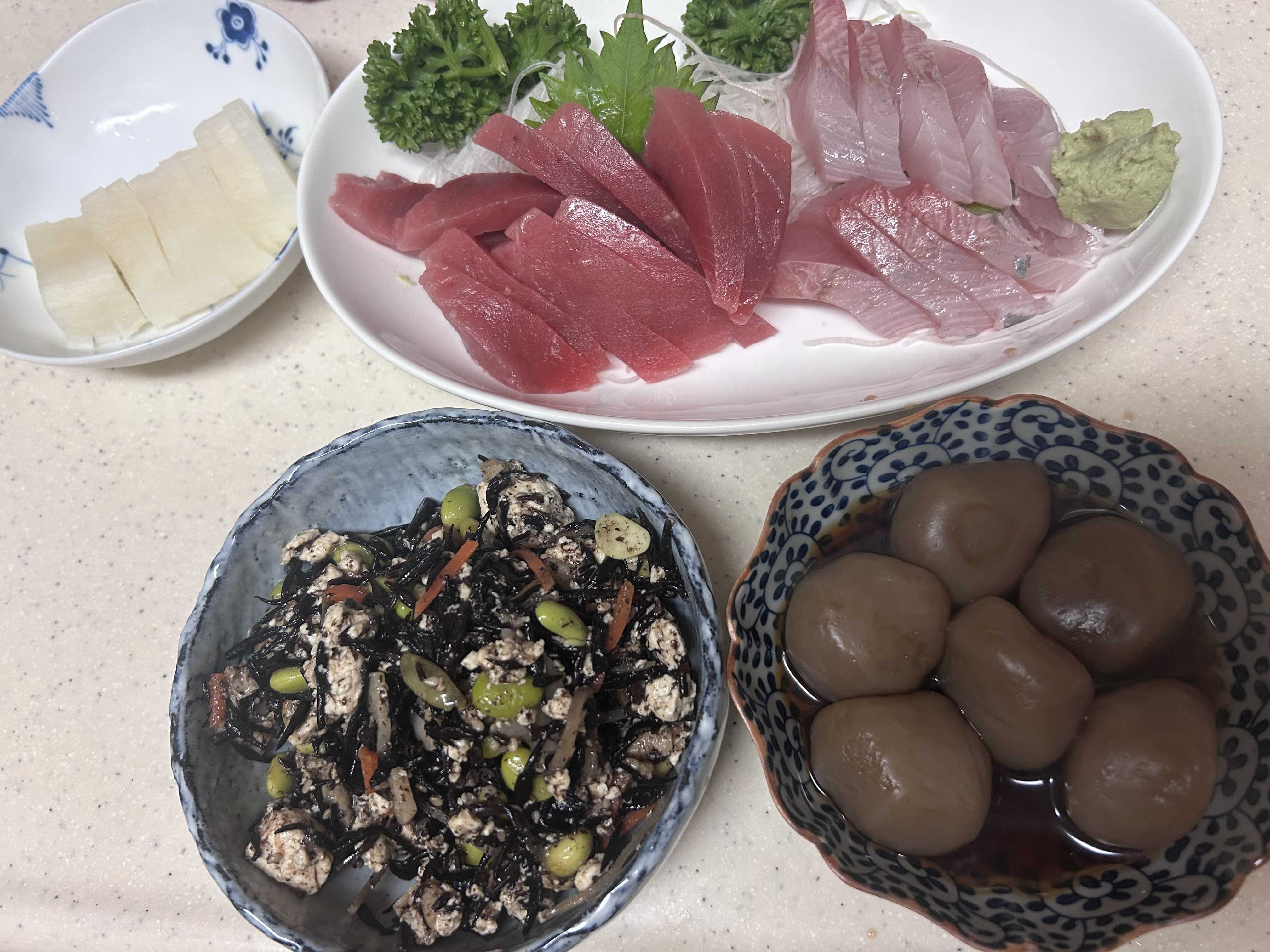 今夜は、お刺身🐟 〜美味しいのに、楽できます。〜楽をしたい日は刺身にします。簡単なのにご飯のおかずになるし、おいしいもん🐟今夜は、カンパチとマグロの赤身🍣セブンイレブンのひじきと、温めるだけのスーパーの玉蒟蒻、笑ブリのお刺身は嫌いだけれど、カンパチは大好き❤カンパチはブリと仲間の出世魚だと思ってましたが魚の種類が違うのですね‼️カンパチもマグロも美味しかったです💡昨夜はロールキャベツで挽肉の脂ガッツリだったので今晩は淡白な料理にしてみたんだよ。私、退院して料理を作る感覚が戻ってきました⤴︎昨日、手際よく作れたんだぁ!ロールキャベツ美味しくできたんだぁ👍相変わらず母親は、美味しいとか不味いとか何も言わずに黙々と食します。父はロールキャベツコレは美味しかったと言ってくれました♪やっぱり、美味しいとか言ってもらえる方が嬉しいです。美味しくなかったら美味しくないと言ってもらっても構いませんが、感想は次回の作戦のために欲しいよね❣️明日は、マックⓂ️を食べるんだぁ!退院して散歩をしなくなったので、体重は少し増えちゃいましたが明日から少し歩くようにしてみます。うん💭そうしよう🚶💨すっぴん、最大のコンプレックスであります。左目眼瞼下垂、悩んでますよぉん。どうするか悩む。。もう、入院中いろんな人に見られたのでブログでも晒しときます😆ナマズみたいな顔してるなぁ笑笑ナマズはメディキューブのパックでぷるるん🫠😉化粧すると少し人間界に居られるようになります笑笑※退院後はまだ飲みに行ってません。入院前の写真です🤳おやすみなさい💤