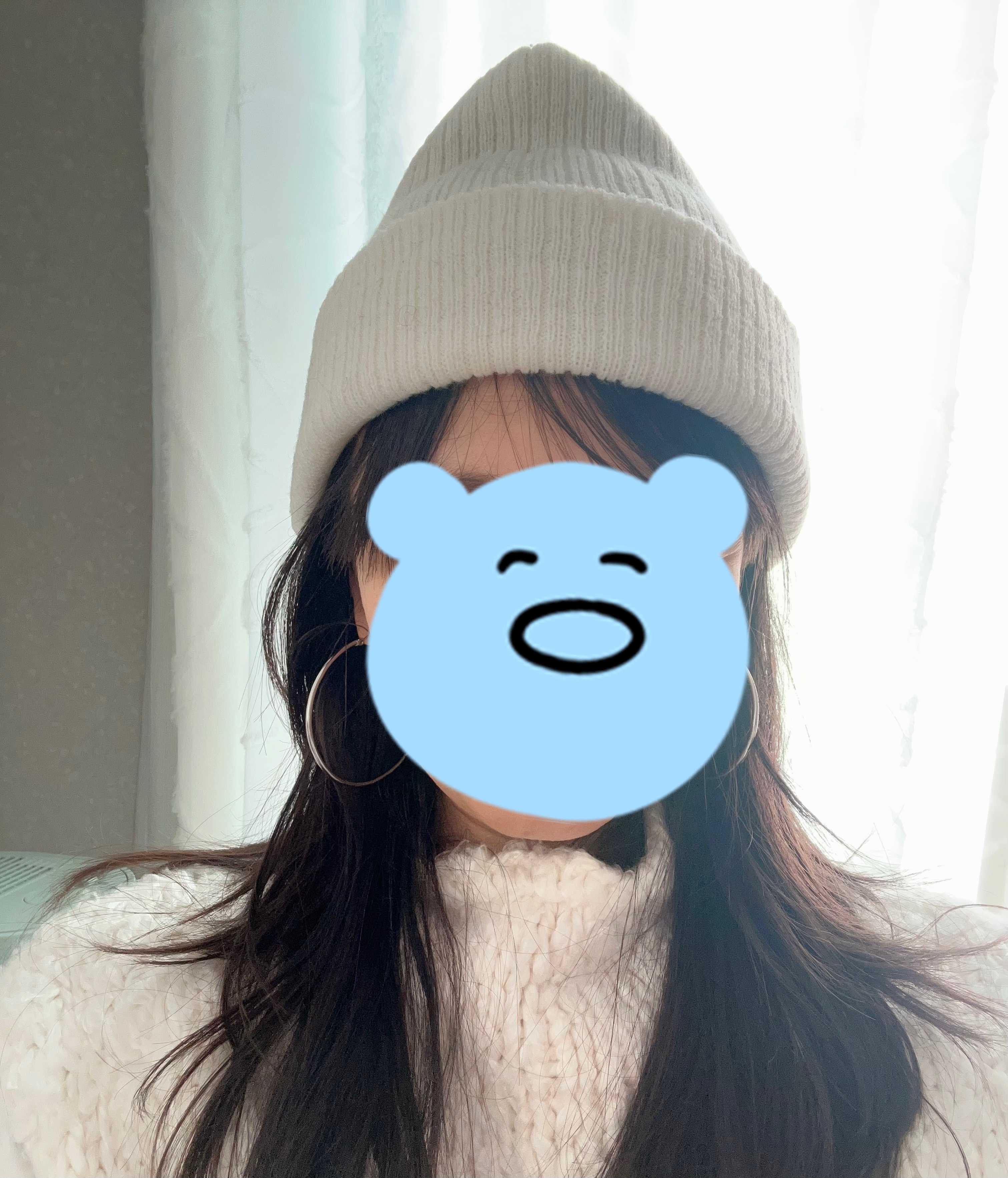 ニット帽は最近は、とんがってる形がほとんどですよね。三角形みたいになって、顔の頬の下膨れが目立ちます💦💦例えば、こちらのニット帽。なんか、変じゃない??お内裏さまみたいじゃない?ラベル(品質表示タグ🏷️)の位置を考えると、この向きが正解です✅ただ、なんか私の顔の形には似合わないんです。なので、ラベルの位置を気にせず横向きに被る💡どう??顔はスタンプしてますが、下の写真の方がかわいくないかい?良くないかい(^∇^)??トップの部分が曲線を描くと、優しい雰囲気になります🌸あの人、帽子の位置間違ってるよ!とか言われるかもだけど後者の似合う向きで被りま〜す✌️