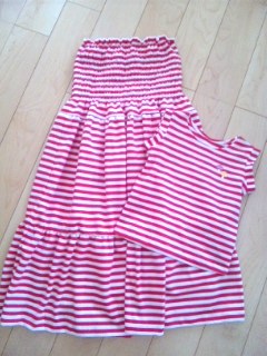 お天気がイマイチの日が続いていますね~数日前よりLiが久々に風邪を引いているので、今週はあまりお出かけせず家にいます。久々の看病、疲れるわ~(何もしてないけど、夜中に寝苦しそうな背中さすったりすると自分が寝不足になってたり・・・)幸い回復に向かっているので明日明後日くらいには完治かな?さてさて、そんな中、また母子お揃い服を作りました布はC&Sさんの「サマーストライプ ピンクライン」です。1M500円とかなりのお値打ち価格だったのにめちゃくちゃ可愛い3M購入したのであと一着くらい何か作れそう何作ろうかな~?(手作りって、高い布さえ買わなければ節約になるんですよね~。そう、リバティとか買わなければ・・・)普段着にさくっと着せたいので、Liのワンピは袖衿ともにゴムギャザーで♪パターンは「あかちゃんの服、てづくりの服」からです。ギリギリ90サイズまで載ってました~(笑)ポッケLOVEのLiのためにアレンジでポケットも付けました【送料無料】あかちゃんの服、てづくりの服私のブラウスも、Tシャツ代わりに着るくらいの感じなので、袖ぐり処理が三つ折りだったり、縫い目がゆがんでたりします~(笑)パターンは久々に買った「FEMALE夏号」生地とかコーデとかがかなり微妙な感じですが、アイテムは意外と流行のラインだったりするので夏物とか量産するのにいいです。(簡単だし)さて、次は何作ろうかな~
