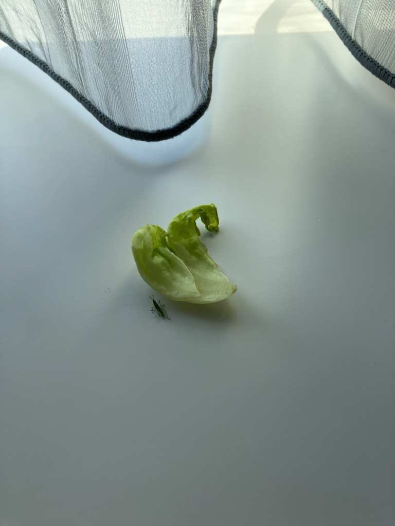 赤ちゃんバッタと、さよならした次の日の朝、ブラインドを開けようとすると、な、な、なんと、バッタが・・レースのカーテンにくっついている。どこに潜んでいたの?外に逃がしたのが、家の中に入ってきた訳でもないし・・また、レタスを置いてあげた。と、いうわけで、また赤ちゃんバッタの世話をすることになった。でも、この赤ちゃん、元気良すぎてすぐにいなくなる。昼間はいなく、夕方は出て来て、また今も見当たらない。自由に動き回っていいけど、出窓からは落ちないでね。ルバング島から来たの?