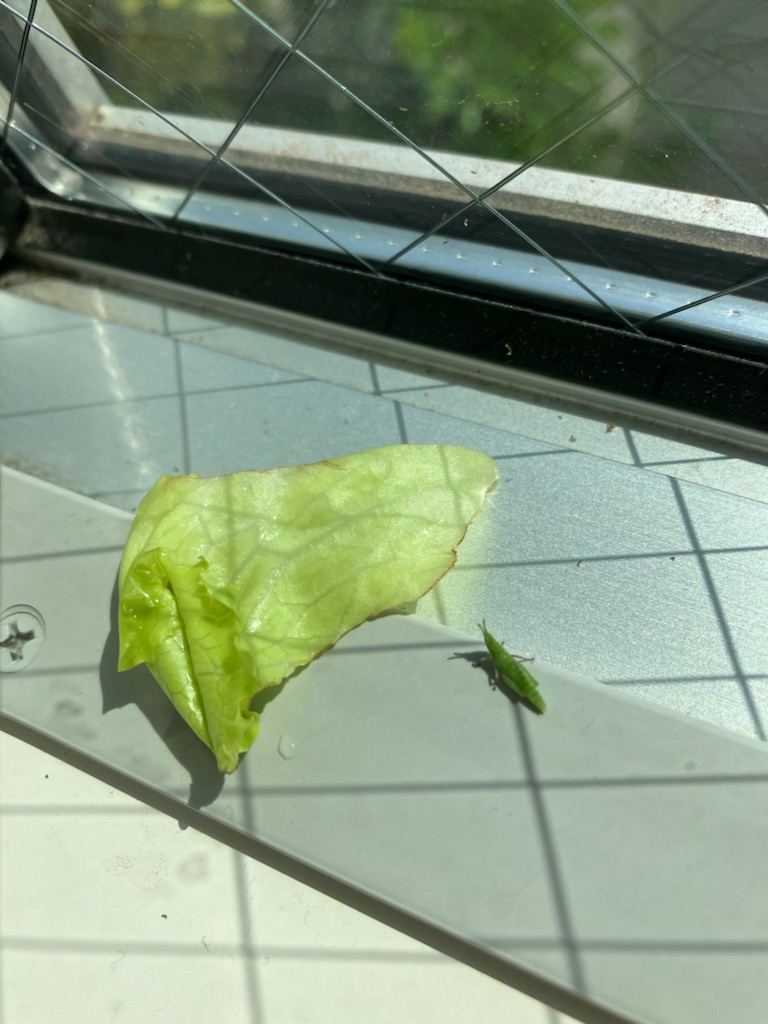 バッタの赤ちゃんは、レタスが好きみたい。レタスのを置いてあげると、上に乗っていた。昨日の朝、どこかに潜んでいた別の2匹が出窓の上にいた。急いでレタスをあげた。1匹は、すぐに上に乗った。そして昨日の夜、壁に1匹。蜘蛛のように、壁にくっついていた。家にいると、バッタが気になる。少し暖かくなったので、外に逃がした方がいいのかな。でも、夜は寒くなるし、風も強い。今日の夕方見てみると、動かなくなって2匹が死んでいたあと2匹、家の中がいいのか、外に逃がしたほうがいいのか・・・この子は、強そうで元気。
