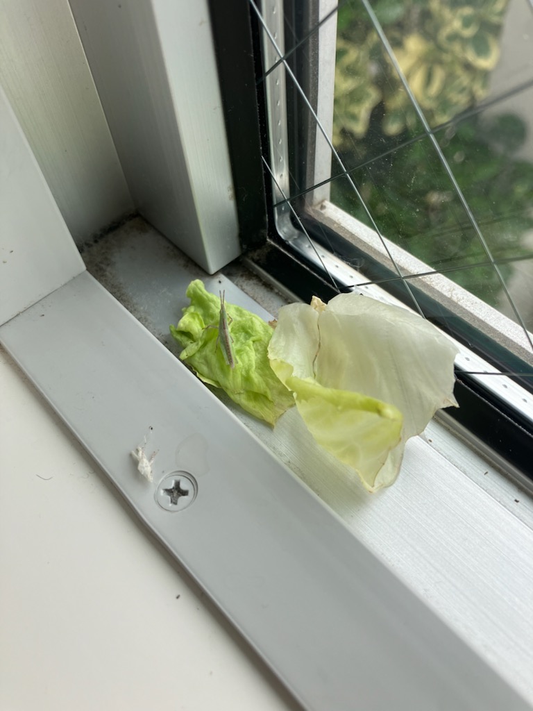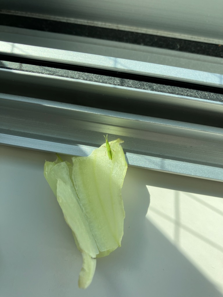 バッタのBちゃんは、2㎝近くなり、完全な成虫になった。生まれてから、3か月半になる。外に逃がしそびれて・・ボクの家の家族になった。3日前、ママが朝起きて、住処のブラインドを開けると、なんと、5回目の脱皮。脱皮の抜け殻が、ブラインドの下につる下がっていて・・アクロバットしながら、脱皮したのか・・すごい技だね。斜め上にBちゃんの尻尾が少し見えてます。好物のレタスをムシャムシャ。