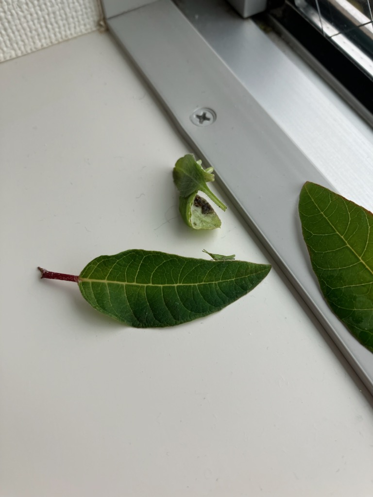 バッタの赤ちゃんが生まれて、5,6日が経った。一昨日、2匹元気な赤ちゃんを見つけて、外に逃がした。なんと、今日一匹見つけた。出窓のレースのカーテンに、くっついていた。すごい生命力。ちょっと、大きくなっていた。昨日の夜は雪、今日は一日中冷たい雨。そんな外に逃がすのは、可哀そう。なので、葉っぱを近くにおいてあげた。夜のこの時間見ると、いたいた葉っぱのそばに。葉っぱが、好きなんだね。