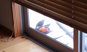 デッキにりんごを置いてみたら、次々とかわいいお客様が・・・。次にみかんで試しましたが、見向きもされませんでした↓ 意外とちゃっかりものです。