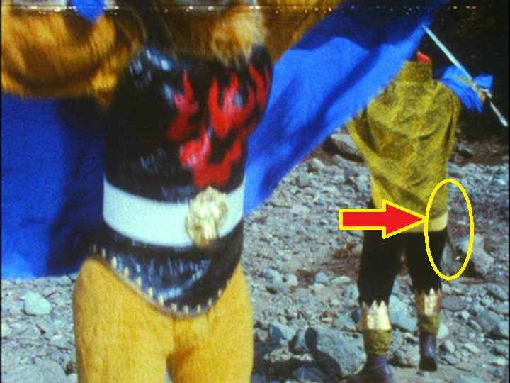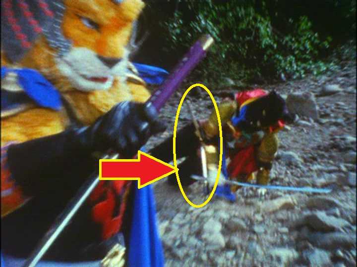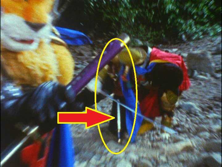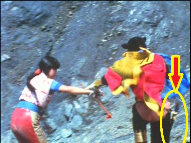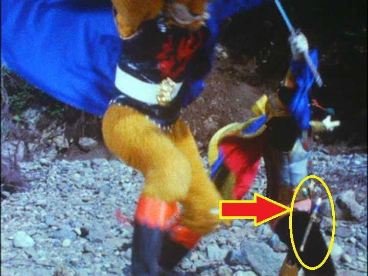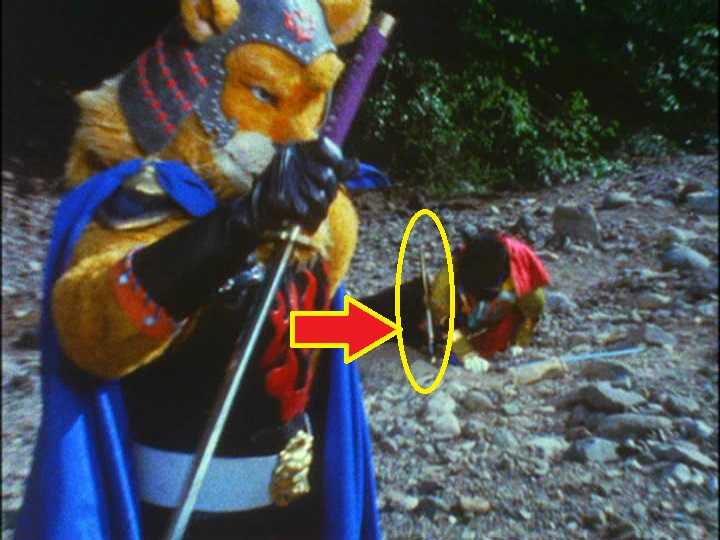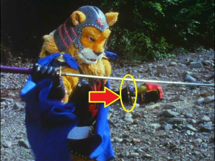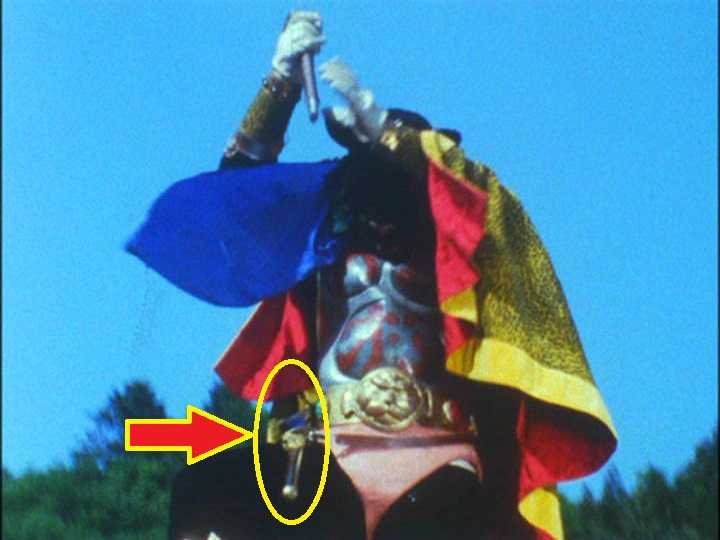 ここでは、ライオン丸との戦いで変身は一回行い、飛び上がるシーンは先ほど言ったようにフィルムの使いまわしで同じなので、短剣は存在します