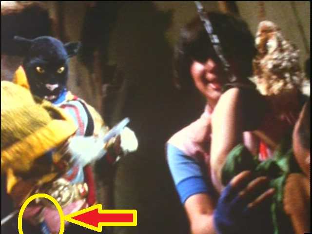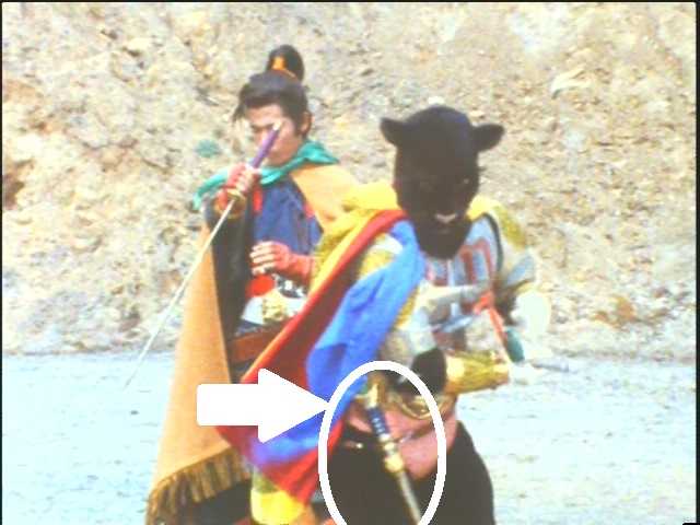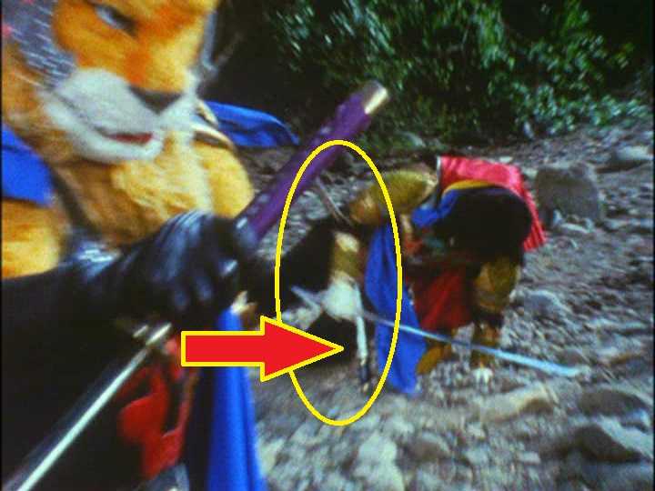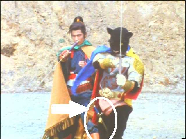 ライオン丸との対決で、ブラックジャガーが返り討ち(みね打ち)にあって、ブラックジャガーが倒れた後、立ち上がろうとして短剣の鞘(さや)が下を向いた瞬間、短剣が落ちてしまう