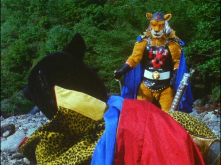 ライオン丸を正面に見て、ブラックジャガーの背中を撮影しているシーンと