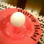 夫がまだ喫煙者だった頃、ホテルの方にこの灰皿のことをお聞きしたら「創業者のデザインです」との答えが返ってきました。赤と白の可愛いデザインです。