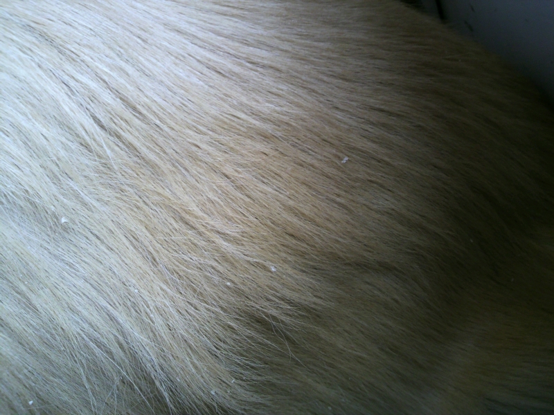 ゴールデンです。 毎月のお客さんです。 デブデブでかなりかなり重症でした。 が、今月はびっくり! ダイエットを行ってかなり体重が少なくなっていました。 もともと外に飼っていたワンちゃんですが、お歳になり徐々に家に入れるようになっていったのです。 それを機会に体重が増えていったのです。 甘やかしているのでしょう。 言うことを聞かなくなってきました。 そうそう ここのワンちゃんは乾燥のために吹き出るフケがあったので激写してきました。 これです この時期に激増するタイプのフケです。 こんなフケを見たらお客さんに説明するのですが、やはりここのママさんのフケがあると言っていました。 説明すると納得してくれました。 乾燥、温度との戦いは続きます。