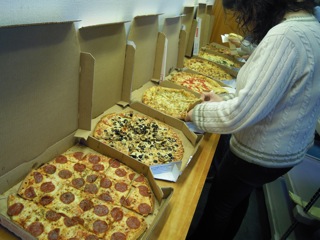 昼にはラボで無料のピザランチが催されたが、大量のピザがあっという間になくなった。(写真は食べ始める前のドミノピザの群れ。)