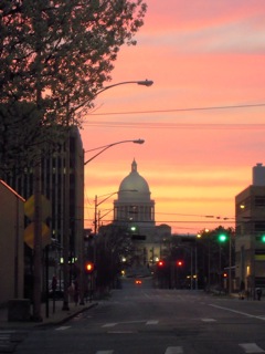 写真はリトルロックマラソン前日の夕刻、ホテル付近から望んだ夕焼けとアーカンソー州庁舎。