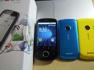 ハナセル 」。友だち紹介などでさらに割引されたりするのでお得なのだが、その会社が初めてスマートフォンをラインアップに加えた。実は最近Wi-Fi環境で簡単にネットに繋ぎたいと考えてiPod Touchの購入を真剣に考えていた矢先のスマートフォンだったので、期間限定割引中だったこともありついつい飛びついてしまった。本日我が家に届いた。OSはAndroid 2.2.1。使い方はまだよくわからない。裏面のカバーは3色付いていた (メタリックピンク、メタリックブルー、イエロー)。