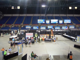そんなこんなで時間を食ってしまい、空港を出発できたのが4時15分頃。そしてカーナビが表示した予定到着時刻は夜7時50分頃ということだった。受付は9時迄なので何とかなると思いスタートしたが、何と大渋滞。そして雨も結構降っていて、渋滞が解消した頃には予定到着時刻は8時25分になっていた。それでも途中でトイレ休憩したりして、最終的にEXPO会場に到着したのは8時45分だった。当たり前だがブースはほとんど終了しており (写真)、ビブとTシャツを受け取っただけで退散。EXPO会場のファーゴドームはノースダコタ州立大学のキャンパス内にある施設で、今晩私たちは大学の宿舎に泊ることになっていた。多少迷ったが、宿舎へのチェックインを無事に済ませた。ホテルではないので食事等は一切なく、近くのコンビニエンスストアで明日の朝食になるものを買ってから就寝。