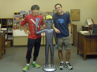 今日の目的地はダラス経由のロズウェル。ロズウェルはニューメキシコ州の小さな街だが、空港にはとてもたくさんの飛行機が停泊していた。中にはボーイング747の姿も、絶対に営業運行では使用されていないはずだが、なぜ大量にあるのかは不明。ダウンタウン迄は10km程だが、機内で知り合った同じホテルに宿泊予定のおじさんのレンタカーに便乗させてもらった。そのおじさんは2週間前にパイクスピークマラソンを走ったそうで、数人の私の友人とも知り合いということだった。ロズウェルは、その近郊で1947年にUFOが墜落したことで有名で、街の中心部はUFOや宇宙人が溢れている。ホテルにチェックインを済ませた後は、歩いて国際UFO博物館へと出向いた。途中で立ち寄ったビジターセンターでは宇宙人の出迎えを受けた (写真)。UFO博物館は入場料が$5とお手頃。ただし、あくまでも観光客相手の商売といった感じで、貴重な資料が展示してあるというわけではなかった。