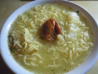 写真は最高の御馳走。餅と梅干し入りのインスタント塩ラーメン (明星チャルメラ)。