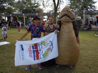 写真はレース後の会場にいたコスプレの人たちと撮ったもの。宇宙にちなんでスターウォーズのコスプレか?ちなみに私が持っているのが完走タオル。なかなか良いデザインだと思う。完走メダルも同じデザイン。