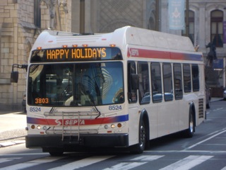 写真は「Happy Holidays」と掲げてフィラデルフィア市内を走るSEPTAバス。