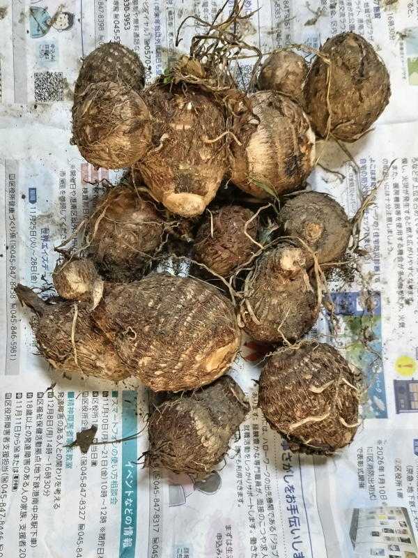 街川散歩里芋です小庭で栽培しました市民農園など借りますればたくさん収穫が望めるの…