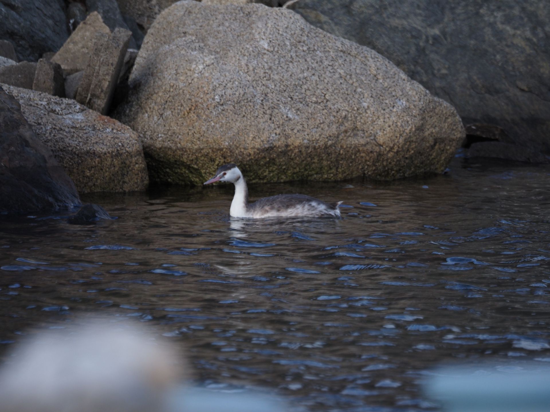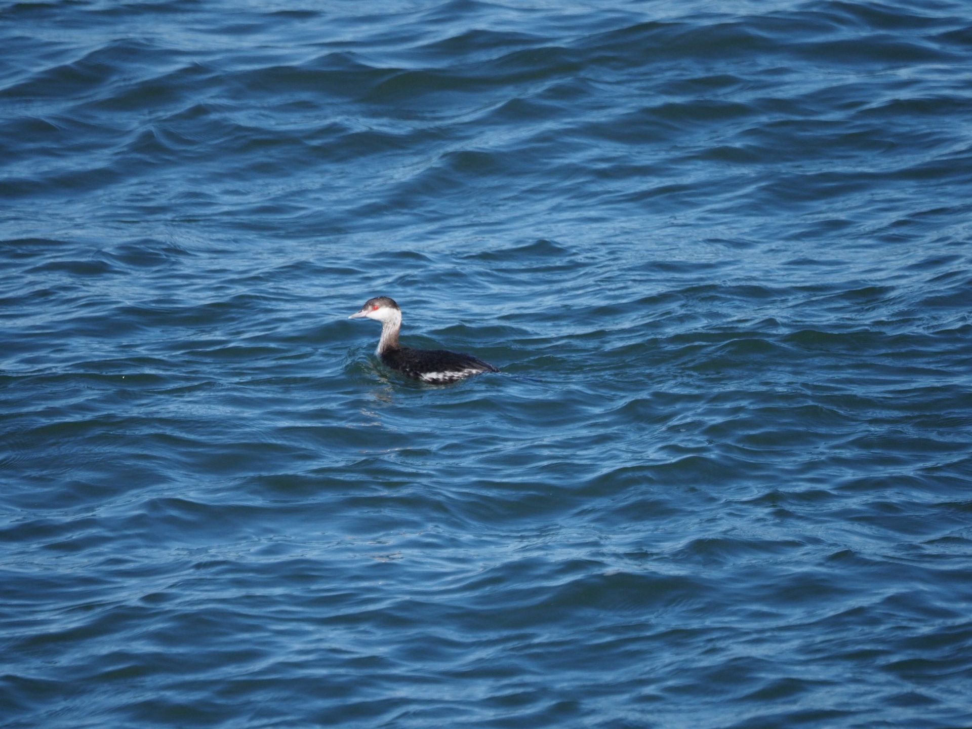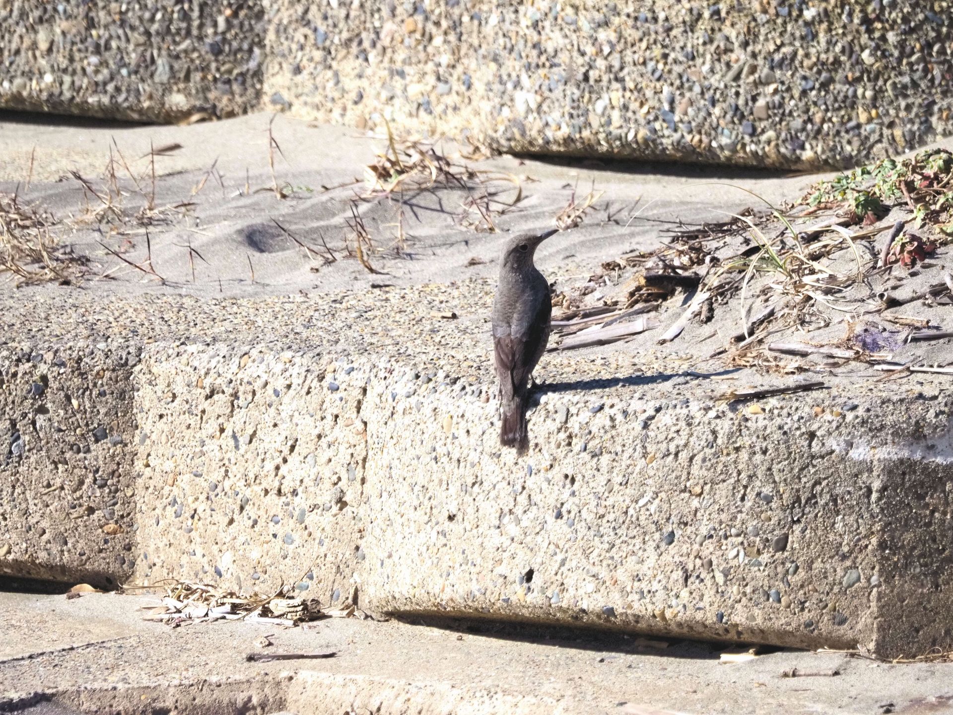 続きです。海を見てたら、たまたま浮かんできました。 今季初見の「ミミカイツブリ」です。だるまさんが転んだ戦法で、近づくことができました。 ついでに、綺麗な「イソヒヨドリ♂」を。
