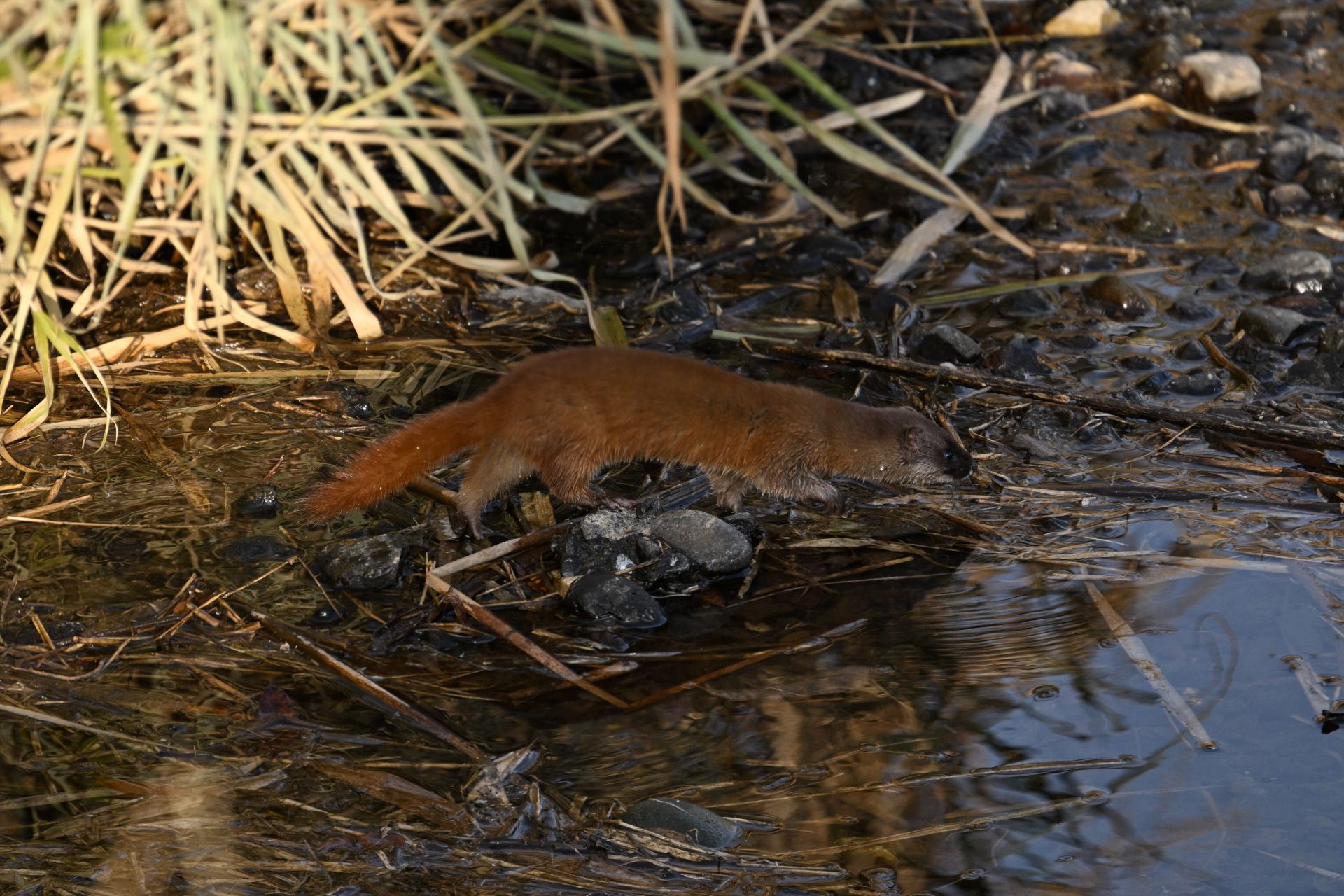 同じ川ですが・・・ 前回のクイナから、10mも離れて無い場所で、「イタチ」が。クイナは、無事なんでしょうかねぇ!? ついでに、「カワセミ」を。