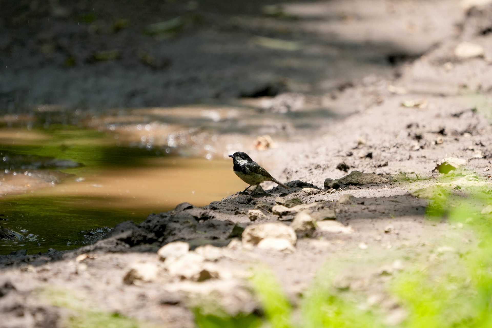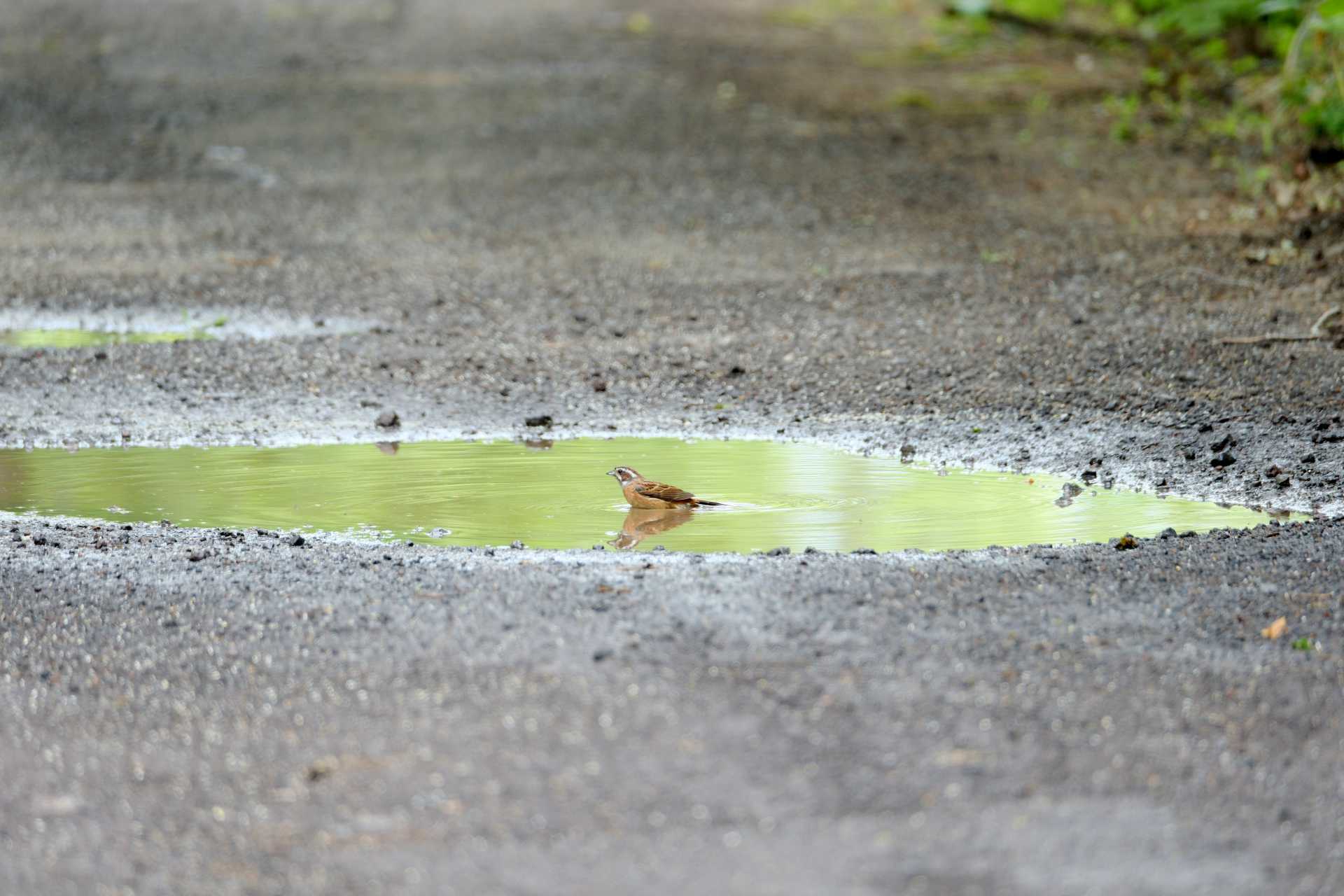 あちこちに水がある日は、厳しいですね。 何か、居るかと確認すると、「ホオジロ」。 近くで動いてたのは、「ウグイス」でした。 遠くで、「キビタキ」が、水浴びしてました。こんな日でも、来るもんです。