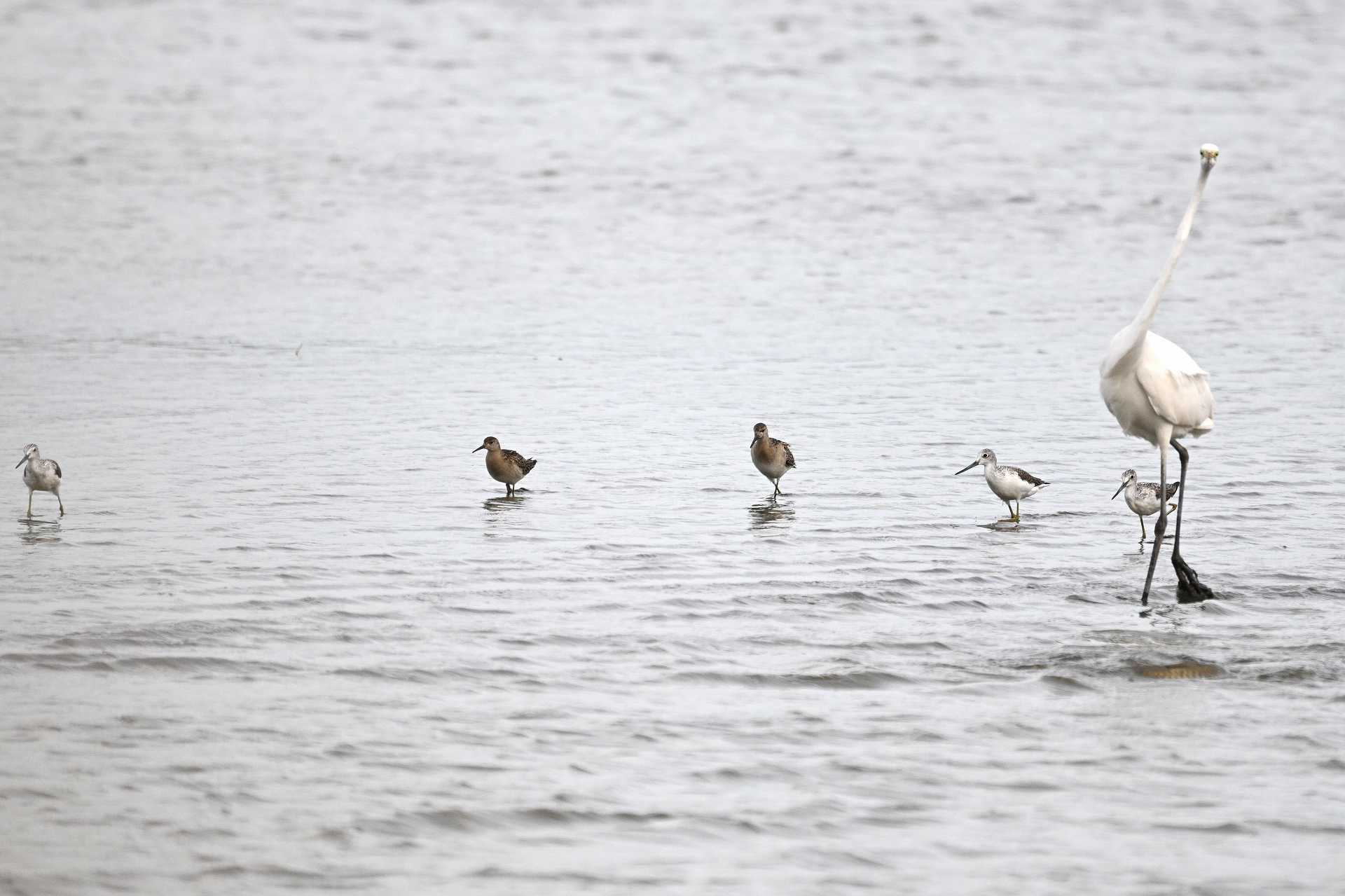 2週に渡って撮ってます。 すごく遠いけど、「クサシギ」。 これも遠い、カルガモの前の「ハマシギ」。 「ツルシギ」。 コチドリの前。 遠くってボケてましたけど、「オジロトウネン」。 大きな「エリマキシギ」。 大小、2羽いた、エリマキシギ。