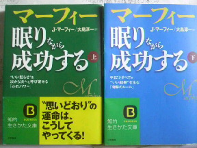 「マーフィー眠りながら成功する上下」ジョセフ・マーフィー 著この本はフォトリの理解を助ける二冊です。というのは潜在意識の活用法を詳しく書いてあるからです。フォトリは潜在意識の活用無しでは語れません、出来ません。ここがポイントになってきます。マーフィー理論は努力することを排除しています。必ず成功出来る心の技術、夢実現のノウハウ、努力は不要ではなく、してはいけない!、金持ちになれる唯一の方法は驚くほど簡単!寝ている間に受け取る最高の富、などなどが詳しく書かれています^^。この言葉を唱えるだけで、お金が絶えずやってくる!という一文を紹介します。「私は自分の潜在意識の無限の富と一体です。豊かで幸福な成功者になるのは私の権利です。お金は私のところに自由に豊富に絶え間なく流れてきます。私は永久に自分の新の価値を意識します。私は自分の才能を自由に発揮します。そして金銭的にも私は素晴らしく恵まれます。それはすてきな事です」この言葉を受け入れ、毎日肯定して、心の中に書き込むとお金が絶えずやってきます。一度、騙されたと思って読んでみてくださいw。