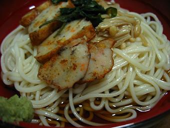 ほぼ毎晩日本のTV番組のビデオを見ている。この間秋にあった「はじめてのおつかい」を見ていたら皆で流しそうめんをするというのがやっていた。うーんうまそう!うちもそうめん食べたい~~。という気分になり速攻翌日の夜はそうめん・・・と言いたいけど、細うどんの袋が開いてたんで先にこっちから。確か2日前も冷やしうどん食ったよなーーと思いながらまた冷やしうどん。2日前はただめんつゆにねぎを入れただけだったので、この日はなめたけ(自家製)と五目揚げを焼いたやつを乗せて、ねぎをおいてみた。めんつゆかけて、わさび入れてOK!冷やしうどんとかそうめんにはしょうが派の人が多いけど、私はわさびが好きです。大満足の夕食。そしてこの翌日にはあったかいうどんをまた食べていました。いわしのつくねと玉子のうどんもおいしかった。麺って毎日でもホンマ飽きないでいいわーー。ビデオ見てるとCMもあるので、色々食べたいもんが出てきます。どう頑張っても食べれないものは仕方ないけど、自分でなんとか出来そうなものは作って欲求不満を解消しております。