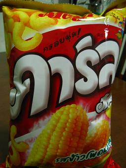 スーパー内をぷらぷらしているとお菓子コーナーが気になった。何かおいしそうなものはないかと見ていたらカールが。しかも見た目にもおいしそうなので購入。25Bなり。ちゃんとカールおじさんもいるし、本物やね。私は勝手に日本のカールのうすあじを想像して食べたら・・・・。甘い(涙)コーンの味よりもバターの味~~。プラス甘い~~~。うすあじのおだしっぽい味を想像して口に入れてただけにショックが大きかったわ。なんでこんなに甘いのよーー。あのうすあじを出して頂きたい。カールはいろんな味があるけど、黄色い袋のうすあじが一番おいしいと思う。一袋1人で一気にいけるわね、あの味は。