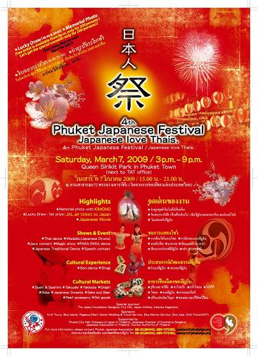 ちょろっと日記にも書きましたが、3月7日に日本人祭りがプーケットで開催されます。15時からプーケットタウンにある王妃記念公園(TATの隣、タイ料理レストラン・レモングラスの向かい側の公園)で開催。イベント内容は、タイ人の日本語を勉強している学生による日本語スピーチコンテストやプロミュージシャンのミニジャズコンサート、和太鼓演奏、やぐらも作って皆で盆踊りに日本行きの航空券の当たるラッキードローも予定してますよ。出店は寿司、焼きそば、おにぎり、おそば、デザートなどの日本食からビール、珍しいラオパン(お酒のシェイク)タイのお菓子、ペット用品店まで出店の予定。 当日は地元のタイ人、在住の日本人、その他の外国人の皆さんに来てもらって楽しんでもらいたいと私たち実行委員は願っています。現在実行委員長を含め、7名ほど委員会の人間がいます。当日私たちはそれぞれの担当につき、責任を持ってお祭りが楽しく安全に進んでいくように準備を進めています。そして実行委員を助けてくれるボランティアの皆さんが必要です。現時点では在住日本人の方も数名名乗り出てくださった人、私たちがお願いしてOKくださった人がいます。そしてタイ人の日本語ガイドさんや実行委員の知り合いの人たちが手伝ってくれます。それでもまだまだ人手が足りません。プーケットリピーターの方や、この時期にプーケットに来られる予定があって時間が許せる方でお祭りのボランティアをしてくださる方がいましたら、是非お知らせください。詳細を知りたい方はコメント欄でも私書箱でもどちらでも受け付けていますので、お問い合わせください。タイ語が出来なくても全然問題ないですし、タイ人で日本語が出来ない方でも問題ありません。1人で多くの方のお手伝いをお待ちしています!日本人祭りのブログhttp://matsuriphuket.blog92.fc2.com/