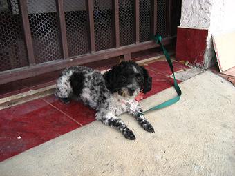 うちの前の家に子犬がやってきた。去年も確かここの家は白いプードルの子犬がやっていたけど、半年くらいでいなくなった。この子はちびにくせに凶暴でなでようとしたら歯茎をむいて怒るので、体をなでる事も出来なかった。やたら活発な子でいつも走り回っていたな。でもある日気づいたらいなくて、旦那に「あそこん家のちびは?」と聞くと「トランに行ったってさ」という返事。えーーー、2ヶ月くらいから育ててきたのになんでトランの実家につれていくのか不思議。可愛くなくなったのかな?うちから見てる感じでは、一緒に暮らせないような事情はないような気がしたけど。そして、またプードルの子犬がやってきた。今度は頭が黒く、体は白ベースでまるで習字の墨をぺぺっとしたみたいな黒が混じっている。模様はあまり綺麗じゃないけど、顔は可愛い。この子、前の子よりも大人しく可愛い。はるを散歩していた時に家の前に繋がれているこの子のとこに遊びに行った。するとじっと座っている。私が優しく背中と頭をなでるとうっとりして、しまいには寝転がって腹見せてるし(笑)。この子可愛いんやけど、飼い主にあまり相手にされていないのだ。まだまだ小さくて遊びたい盛りなのに遊んでもらってる姿を見ない。いつも家の前に繋がれている。ちょっと悲しげな表情がつらいな・・・。夜も皆出かけてしまって1人ぼっちで声がかれるまで鳴いている姿が可哀想。こんなに放置されてても人が帰ってくると嬉しいみたいで、きゃんきゃんはしゃいでいる。その姿もなんか切ない。寝る時も家の中には入れてもらえない。前の子もそうやったけど、まだ夜鳴きがすごい。寂しくてきゃんきゃん鳴いてるから、時々気になって見に行ってしまう。これは人の家の犬やから私が見に行ったりするのは良くない事やとは思うけど、子犬にこの扱いはないやろーーとお節介を焼いてしまう。飼い主からしたらほっといてくれってなもんでしょうが。そんなに可愛がらないならなんで連れてきたんやろう・・・またある程度したらトランに行ってしまうのかなと思うとちょっと・・・・。またはるを連れてこの子のとこへ遊びに行こうっと。はるは犬嫌いだけど、小さい子はOKみたいでくんくん嗅いでた。別の家にいるちょっと大きなでも子供の犬はやたらはるに近寄ってくるけど、嫌みたいで必死で逃げている。こいつなかなかおもしろくて、はるは嫌がるけどうちが会いたくていつもこいつの事を探して呼んでしまう(笑)。