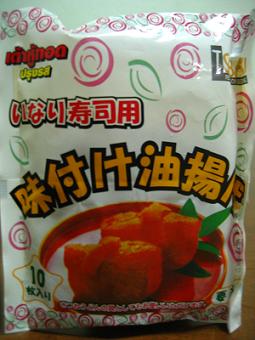 数ヶ月前に日本で買ってきてもらったおあげさんで、おいなりさんを作ったらやっぱとてもおいしかった。同じものがTOPSでも売っているけど8枚入りで109Bだかなんだかするので、高くて買えない。半額になる日を待っています(笑)。しかしカルフールでこんなものを見つけた。豆腐や麺の売り場を見ていたら目にとまったので、買ってみた。10枚入りで52B。日本からの輸入ものの半額だ。味はどんな感じかというと、ちょっとしょっぱい気がするけど、OKの範囲。日本のはもうちょっと甘い気がするので。でもこっちで52Bでこのレベルのものが買えるならOKでしょう。という事でまたおいなりさんが食べたくなったら買うでしょうね。作ったその日に1個食べて、翌朝に1個、昼飯に4個、晩飯に4個とおいなり三昧となりました。うどんかそばが欲しかったけど、昼飯の時に味噌汁にしただけ。結構自分の周りにおいなりさんが好きじゃない。という人が多いので、おいなりさんを一緒に食べようと誘える人がいない・・・・。誰か今度一緒においなりさん+うどん食べましょう~~。