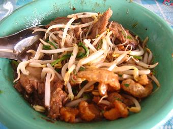 プーケットビラ3の近くのクイッティアオルアはおいしい。前は近くに住んでいたので時々食べに行ったけど、引越しをしてからやはり離れてしまったのでなかなか行けなかった。数週間ほど前に食べたくなったので、行ってみた。やっぱうま~~~い。見た目はあまりよくないし、スープに血が入っているという事でいやーーとか言う人もいる。私も実際に食べてみるまでは気持ち悪いとか思ったけど、全然くさくもないし本当においしい。ちょっとスープにすっぱさがあって、更に私は酢を入れてもっとすっぱくして食べると最高。更におまけについてくる生もやしとホラパーをちぎって入れるといい香りもする。初めて食べた感想は「ソース焼きそばみたいな味」だったので、全然クセもなくおいしいもの。なんか気持ち悪くて・・・ってな感じで食べていない人は近所でおいしいと評判の店で一度食べてみて欲しい。これから暑さが厳しくなる季節。私は暑くて体力が落ち気味な時に以前よく食べていました。なんか元気になれる気がして。ちなみにこのお店、普通サイズは1杯20B。大盛りは30Bです。