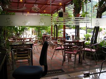 本当にあっちこちに増え続けているコーヒー屋さん。パトンの有名なカップクルアイの向かい側に小さなコーヒーショップが出来ていた。ちょっと前からあったけど、入り口に木が生い茂ってて中がちょっと見えにくいので、入りにくい感じがしていたけど、マッサージの後に入ってみた。コーヒー、ケーキ、サンドイッチのほかにもタイ料理もメニューにあって、カップクルアイと同じオーナーなので味も同じようなものだと思うので、おいしいと思う。実際にタイ人のお客さん2人がご飯を食べに来ていたので、高くなくおいしい証でしょう。カップクルアイはエアコンがないので、エアコンの効いた部屋で昼ごはんが食べたいわ。という時にはこちらが良さそう。この日はアイスラテとホワイトチーズケーキを注文。ちょっと食べかけですが、途中で思い出し写真を撮りましたよ(笑)。ケーキはどこからか仕入れていると思うけど、なかなかおいしかった。コーヒーはアイスもホットも55Bと同じ料金で、エスプレッソは30Bでしたよ。コーヒーもちゃんとしてておいしかったので、パトンで昼間にお茶したい時にはこれからも利用しそう。しかもネットも使用出来るし。暇な時にいいかもなーー。ネット利用はタダやし(笑)。1台のPCが入り口近くに置いてあったわ。夜の営業はやってないようなので、昼間のご飯やお茶に利用出来そうな店です。