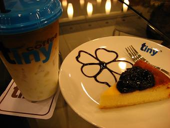 あぁ本当にプーケット中にお気軽にコーヒーの飲める場所が増えお喜びしていますよ。晩御飯を食べた後「お茶しよっか?」と行った先はチャオファー通りに新しく出来たガソリンスタンド・シェルに併設されているTiny Coffee。プーケットタウン内には何年も前からあったけど、車が停めにくい場所にあるので、1回も行った事がなかった。今回ガソリンスタンド内なので、車が停め放題という素晴らしい立地。コーヒーのほかにもケーキやご飯も食べる事が出来るお店。私らは晩御飯を食べてきたので、コーヒーとケーキ←食いすぎ。パトンのコーヒータイムにあったのと同じケーキ類が並んでいる。私は前はホワイトチーズケーキを食べたので今回はブルーベリーのチーズケーキにした。コーヒータイム、Tiny Coffeeともにおいしいのはホワイトチーズケーキとブルーベリーのチーズケーキだ。他はチョコレート系ばかりだけど、どれもかなーーーり重そう。前にブラックフォレストを食べたら、このうちが食べ残してしまったほど。かなり甘かったし重かったわ。夜の10時まで開いているので、便利なこの店。
