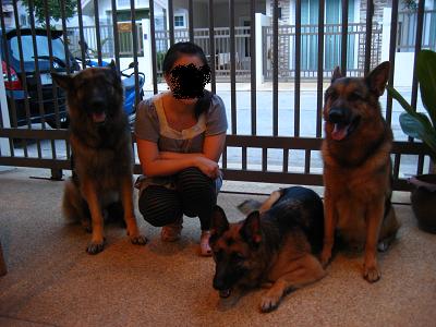 お友達のケロさんがパトンのジャンクセイロンにあったお店を閉めて、シャロンに新しくお店をオープンするという話を聞いた。そのお祝いをしましょう~!というお誘いを受けて、烈ママさん家に行ってきた。烈ママさんと言えばプーケットでシェパード3匹と暮らす方。日本人のご夫婦です。ブログには何度もお邪魔していて、この3匹のシェパードの事は知っていて、いつか会ってみたいなと思っていた。しかし私は大きな犬にはちょっと恐怖心があって、なかなか踏み出せなかったけど、お呼ばれした事でトリオに会う事が出来てちょっと興奮したわ。家に着いて門のとこにいると、家の中にいるトリオは大興奮。誰が来た~~~、早くにおいを嗅がせろ~~(笑)ってな感じでしたね。家のドアから飛び出して来た時には、初めてですからね大きな犬と近くで接するのが。私はちょっとびびり気味で動けなかったし烈ママさんに「そのまま!」と動かないよう指示されたのでじーっとしていました。ひとしきり私の事をチェックしたトリオは「怪しくない」と判断してくれたようで、そこからは近くに来てくれたり、熱い視線を送ってくれたりして、大型犬の可愛さに触れる事が出来た。はるよりも何倍も賢いですからね。ちゃんとしてますよ。でも本当にリラックスしている感じで寝転がったりしてて、あまりに静かやからトリオの存在を一瞬忘れるほど。でも寝ててもお父さんに「烈、来い」とか呼ばれたらさーーーっと走ってきて、待ってる。可愛かったわ、ホンマに可愛かった。ちょっとびびり気味な私の事もちゃんとトリオはわかってるようで、そっと近寄ってくれたり、紅一点の蘭ちゃんなんかもやさしーーく私の事を見つめてくれたり。一番体の大きな良くんは大きいけど、気が弱いみたいですぐにきゅーんきゅーんって子犬みたいな声を出して。またすぐに会いたくなっています。烈ママさん、また遊びに行きますね。昨日はありがとうございました。