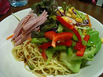外食するとどうしても脂っこいものやカロリーの高そうなものになるので、家では出来るだけさっぱりしていたり、カロリーの高そうでないものを食べたり、量を控えめにしています。スーパーに行くと野菜を必ず買うようにしていますが、時々生野菜が食べたくなり、そうなるとレタスを1つとか買うと飽きてしまうので、サラダバーに行きいろんな野菜を数種類買うようにしています。1回買うと2日食べれるくらいにしているので経済的。(30Bぶんくらいを2日に分けて食べる)今回は1日目は普通にサラダとして半分食べて、2日目は数日前から食べてかった冷やし中華を。冷やし中華でもヘルシーなサラダ冷やし中華。具は野菜とハム。玉子はないんですよ~~。今回タレはしょう油、カルパッチョ用のドレッシング、酢、砂糖、和風ドレッシング混ぜてしまい。このハム、TOPSの輸入品コーナーで通常1パック199Bもします。そんな高価なハムは定価で買う事は出来ないので、値引きされているものを狙う。賞味期限まであと2日に迫っていたこのハムちゃん、なんと39Bまで下がっていました。賞味期限近くて値下げしているハムを買う勇気がすごいとか言われたけど、なんの事はない。開けて変な汁が出てなくて、食べて酸っぱくなかったらOK!!もし少々ねっとりしてても洗って焼いたらこれまた問題ないしねぇ。自分で食べて危険か安全か見極めるのさ。あたったら最悪、下痢と嘔吐&熱で苦しむ羽目になるけど(笑)。これはまーったく問題なしでした。薄っぺらいこのハム、うまかったよーー。また39Bになってたら買おうっと(笑)。
