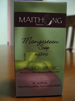 タイにはいろんな種類のハーブ石鹸がある。最近は体にはボディソープを使ってるけど、洗顔用は石鹸が好きで、結構いろんなものを日本のものタイのものを問わずに試している。この間まで使っていた石鹸がそろそろなくなるので、何か違うものを探さないとな・・・と思っていたら、BOOTSに行った時に店先の特価コーナーにあった。BOOTSは安い!という感じではないけど、いつも店先に特価ボックスがあってそこに割引商品が色々入っている。これはしっかり見ておいた方がいい。この箱の中に探していた石鹸はいつもは55Bのものが49Bで売っていた。マンゴスチンとレモングラス、ジャスミンライスなどがあったけど、今回はマンゴスチンに。数年前日本でも大ブレイクしたマンゴスチン石鹸だけど、タイではいつも普通に売っていて、香りもいいし洗いあがりもさっぱりするので、今の暑い季節には合うと思う。各メーカーにより違いはあるけど、BOOTSで見つけたものはすごくいい香りがしてるし、つぶつぶとマンゴスチンの実だか皮だか知らんが入っている感じがする。まぁすごいこだわりはないけど、クレンジングをした後にさっぱりと洗いあがって、気持ちよければなんでもいい。箱も可愛いデザインで、きついにおいでもないので、お土産にやはりいいかもな。今度はレモングラスを使ってみたい。